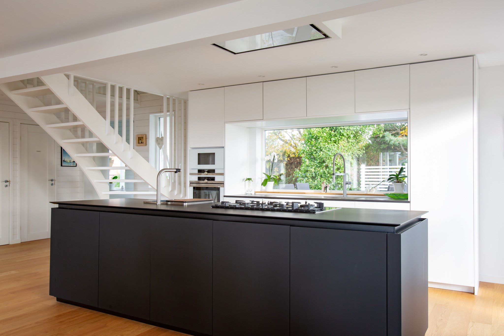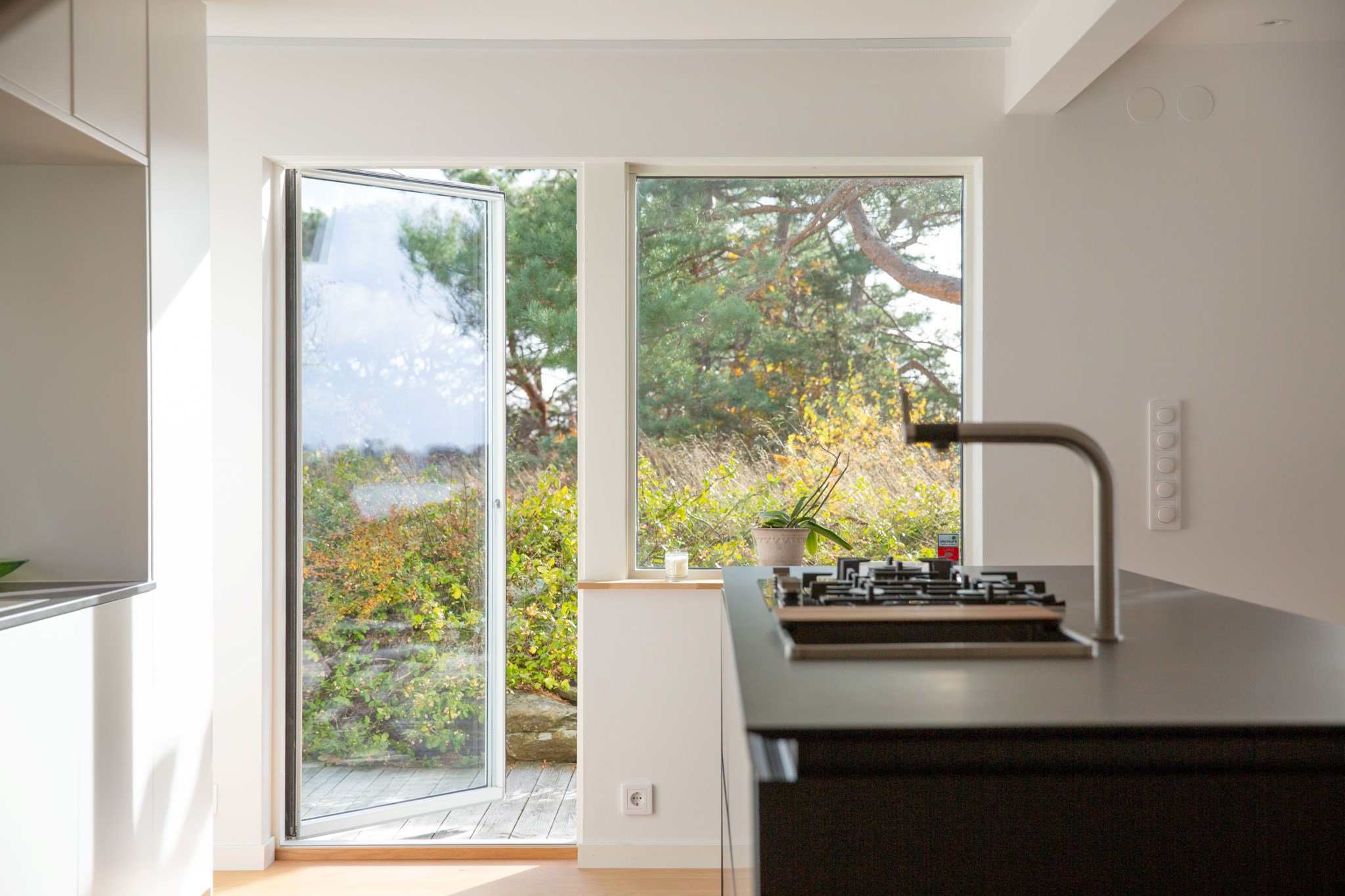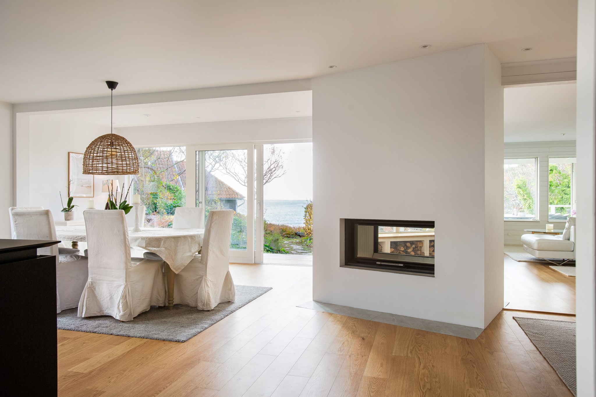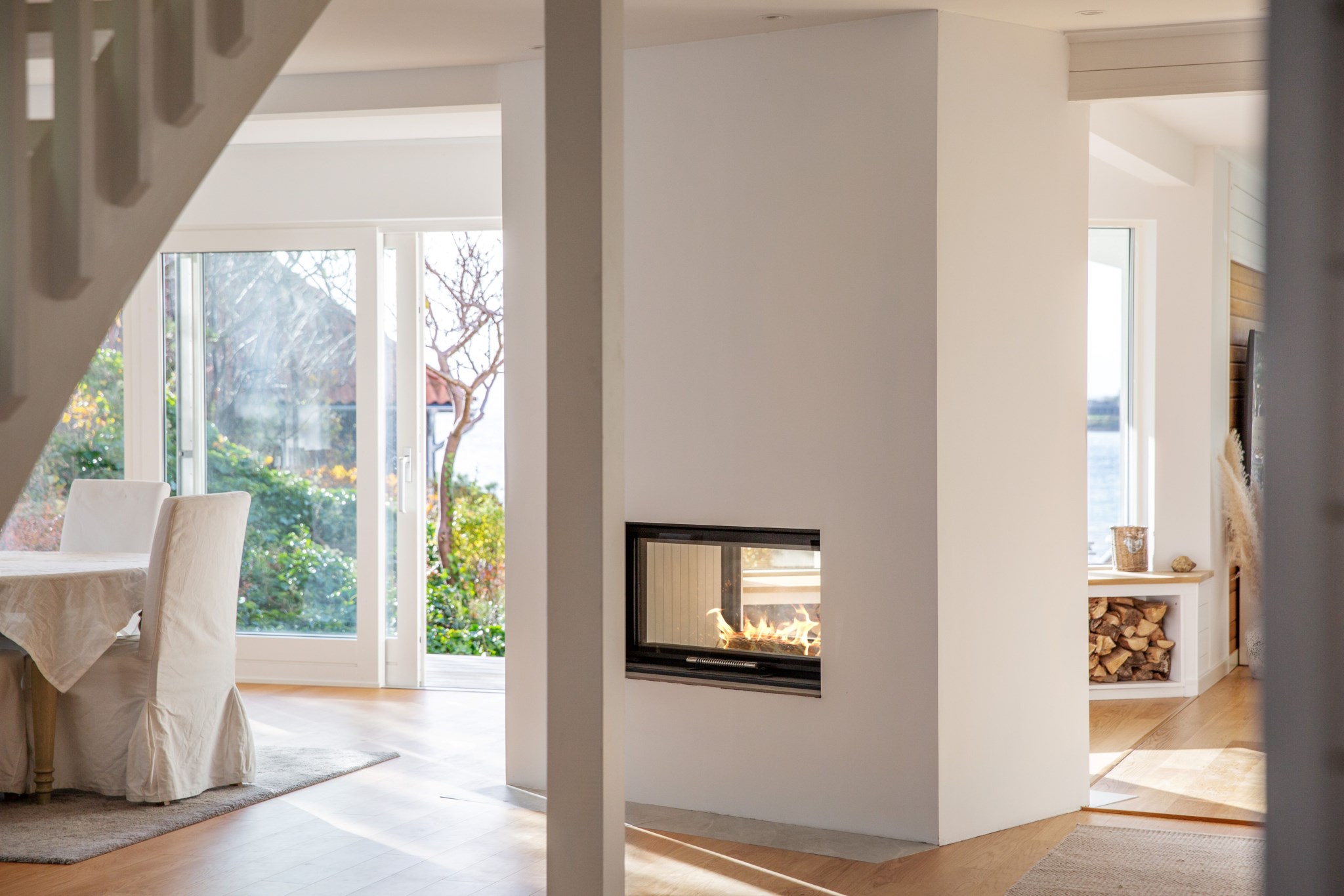 Fönstersättning har ändrats sedan tidigare och nya fönster har tillkommit. Den gamla murstocken har rivits och ersätts av en större modern effektiv kamin med tunneldesign så att man ser eldstaden från två håll, både från köksdelen och vardagsrum.