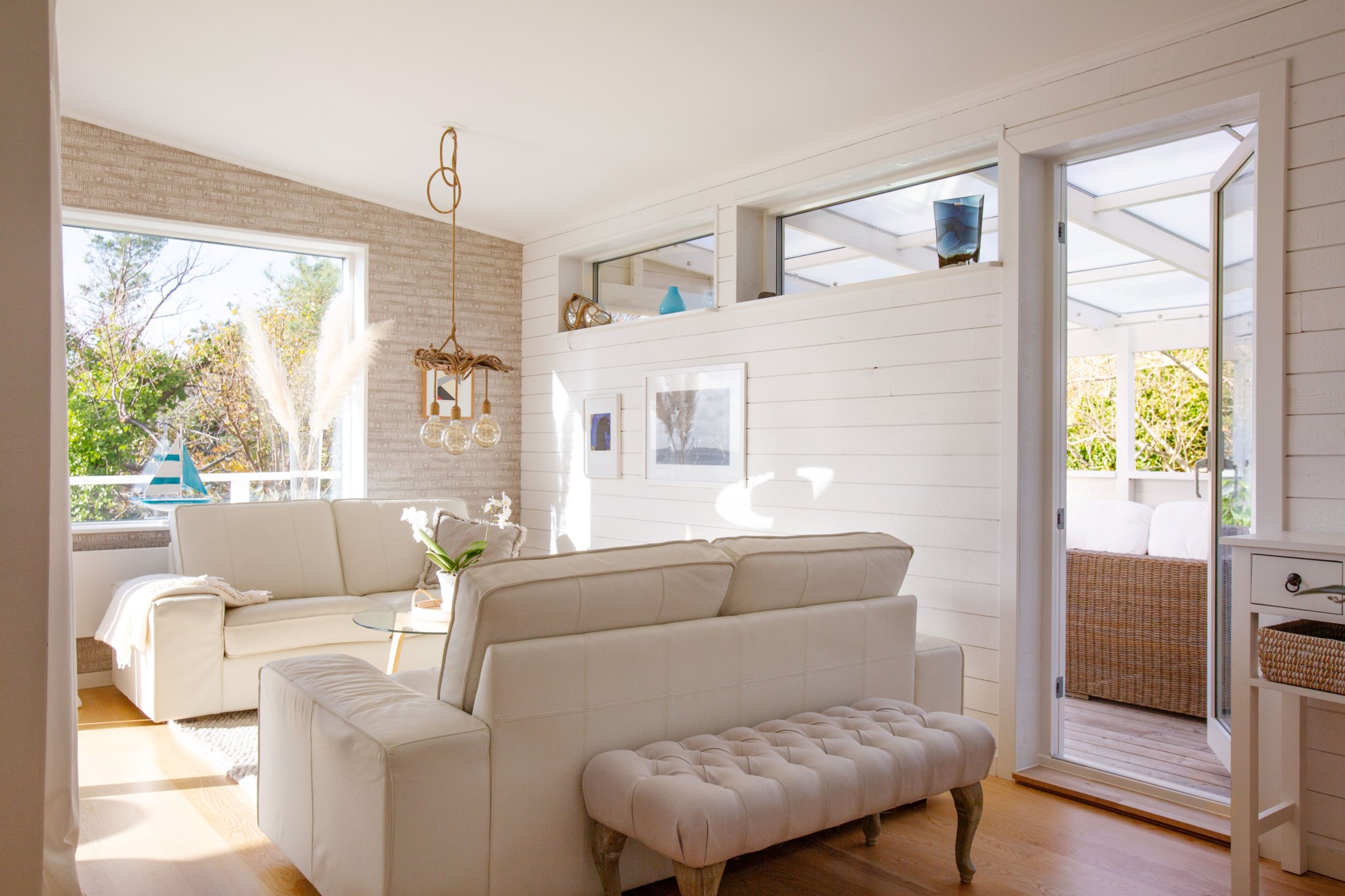 Ekparkett och väggar i vitmålad träpanel. Här finns plats för stor soffgrupp med tillhörande möblemang och TV-möbel. Utgång till uterummet.