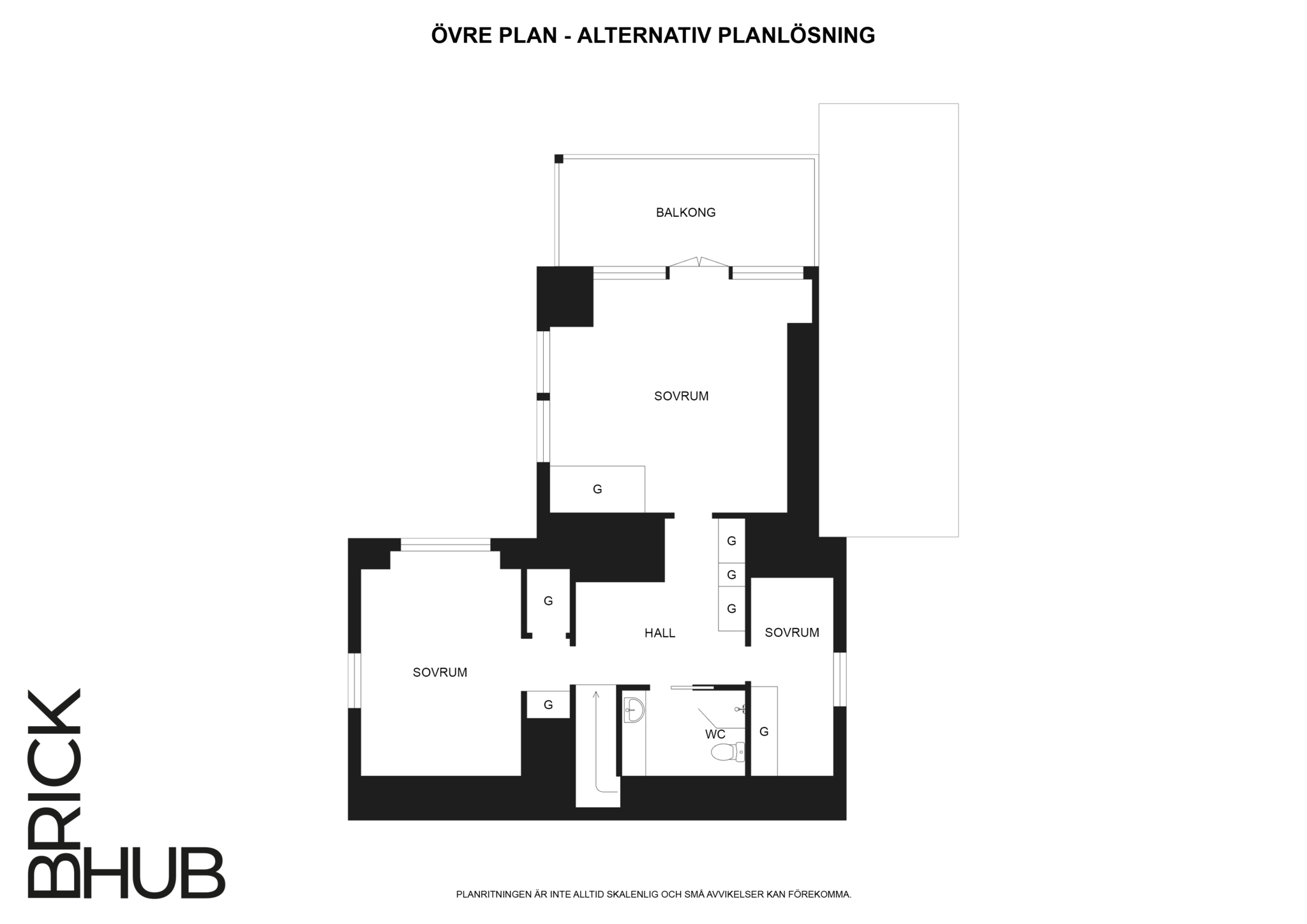 Utrustat med WC, handfat och väggspegel. Badrummet går att bygga ut. Förslag finns på den alternativa planskissen.