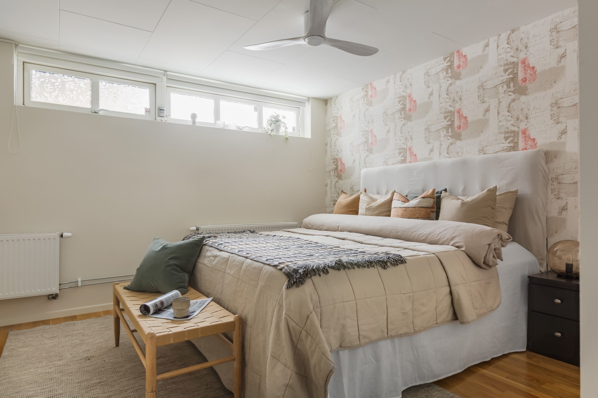 Ekparkett och ljusmålade väggar med en tapetserad fondvägg. Plats för dubbelsäng med tillhörande sängbord. Klädförvaring i tre dubbelgarderober.