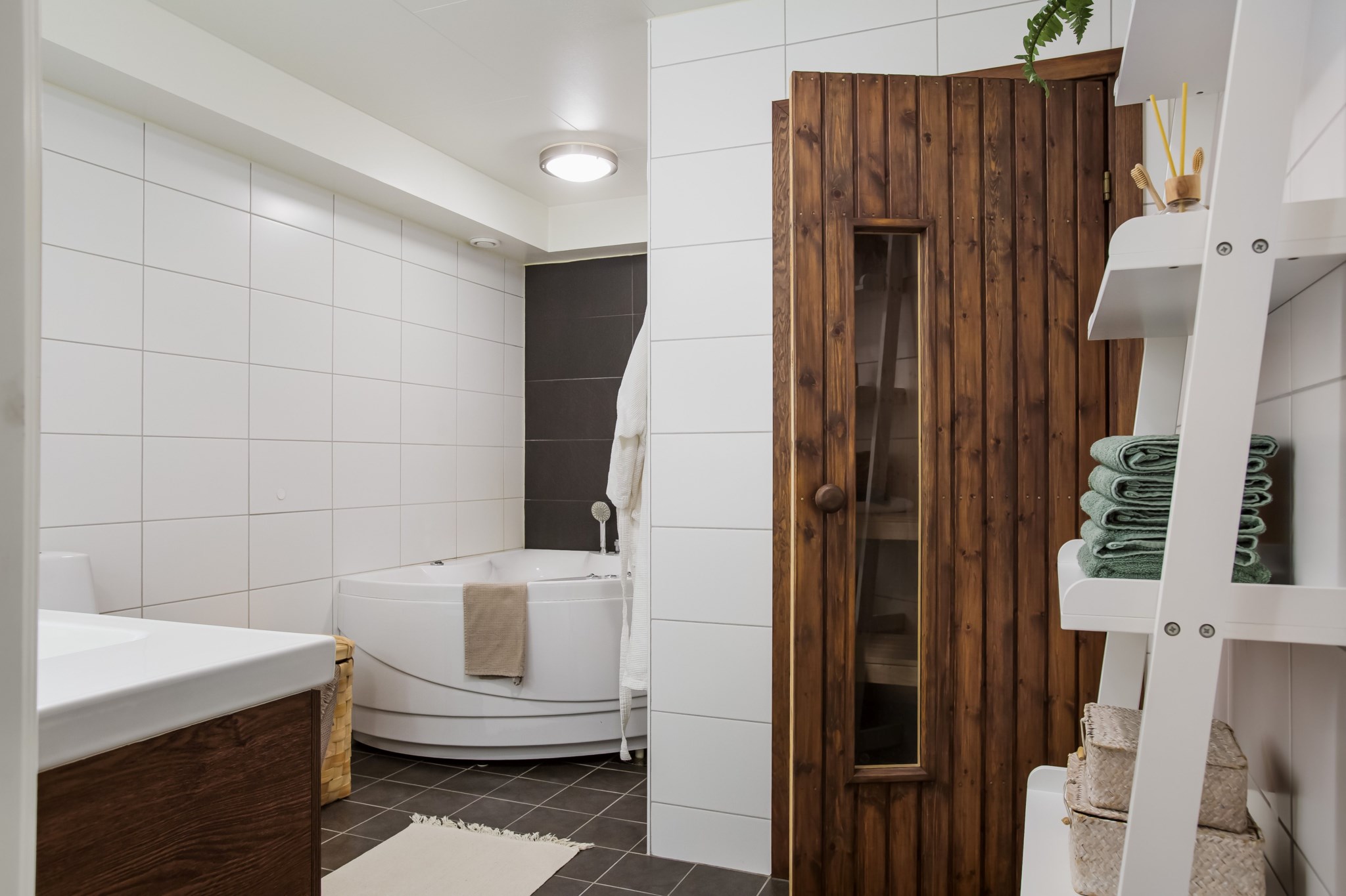 Grått klinkergolv och helkaklade vita väggar med svart kaklad fondvägg. Badrummet fungerar som hemma-SPA och är utrustat med brett handfat med kommod, spegel, WC, bubbelbadkar. Här finns också en bastu.