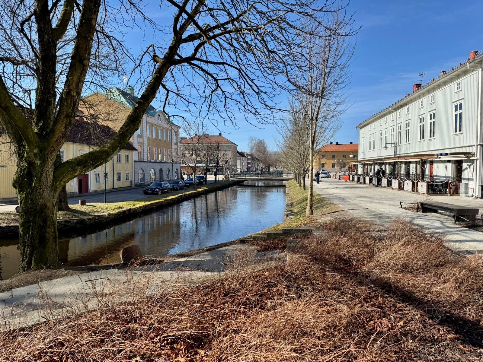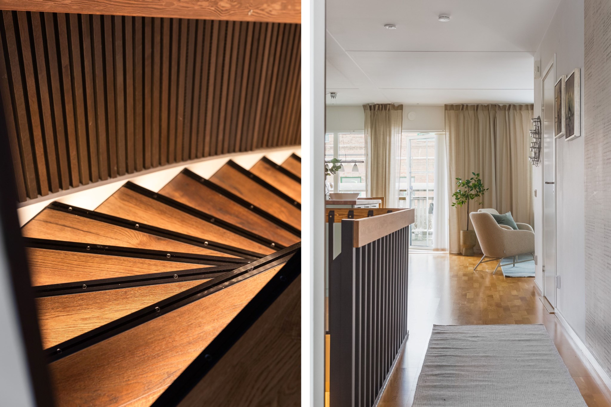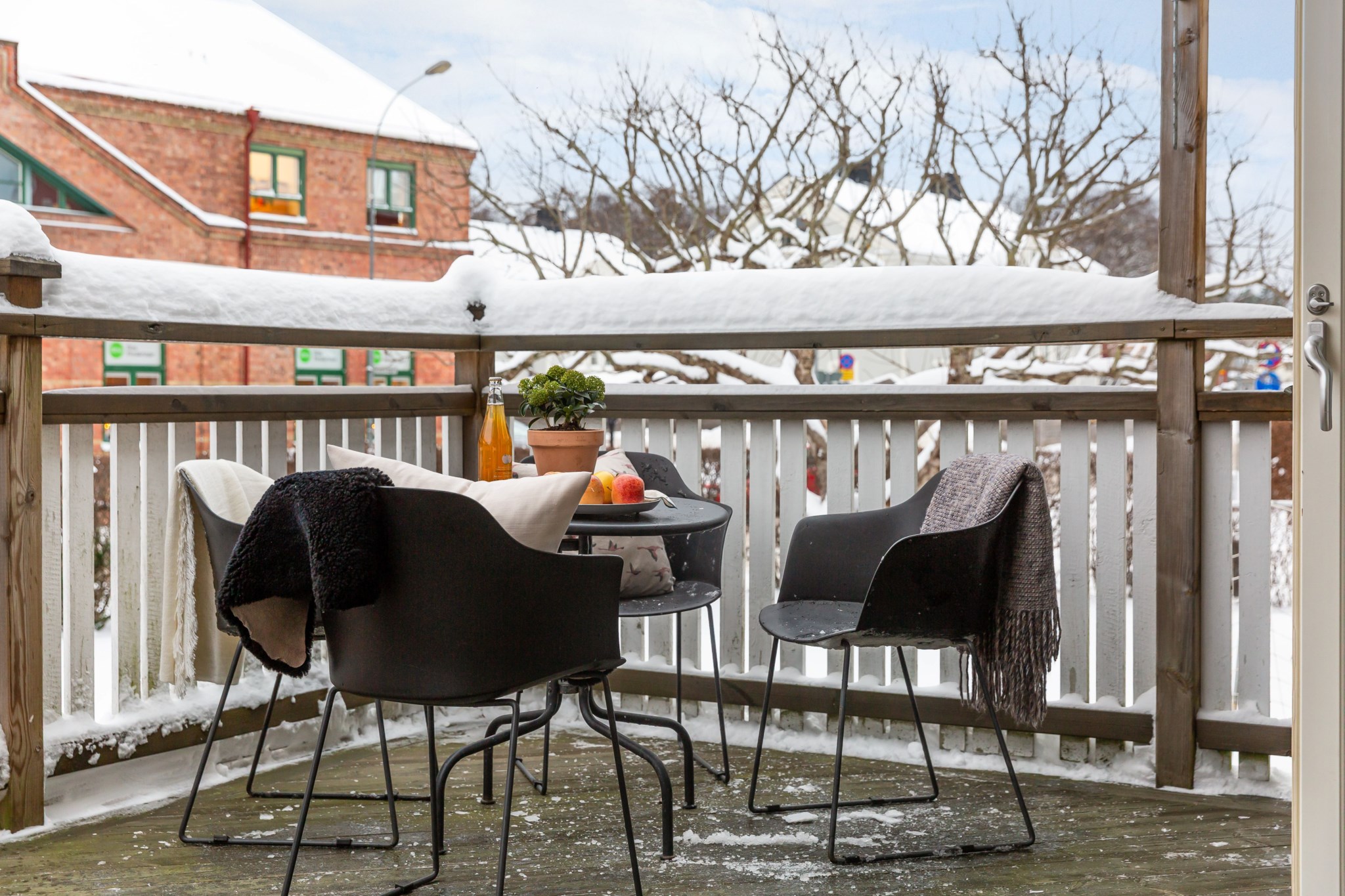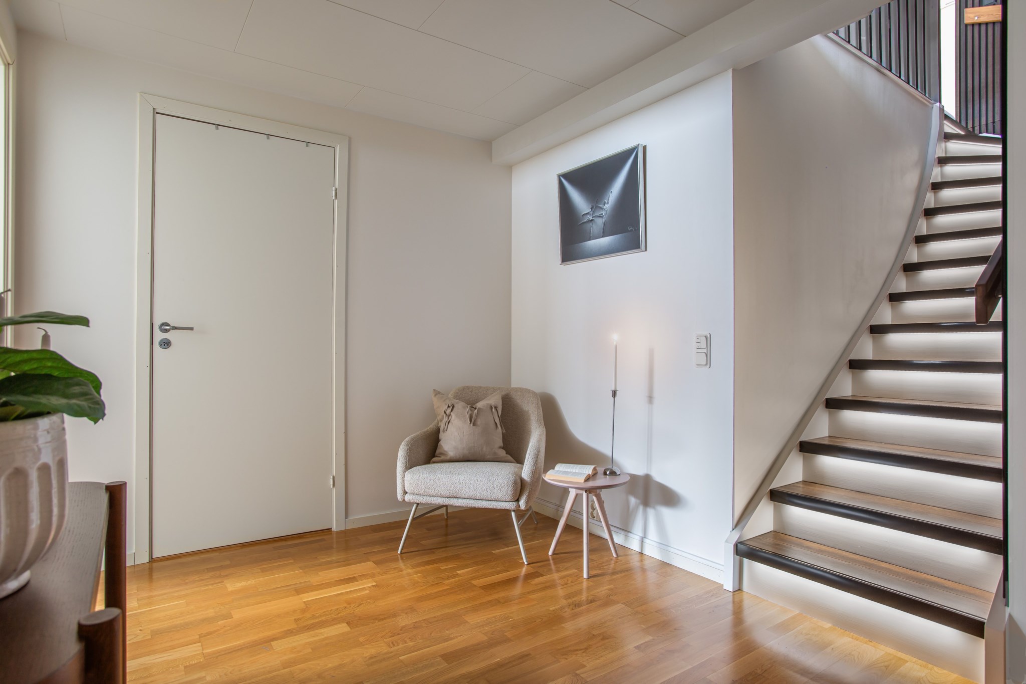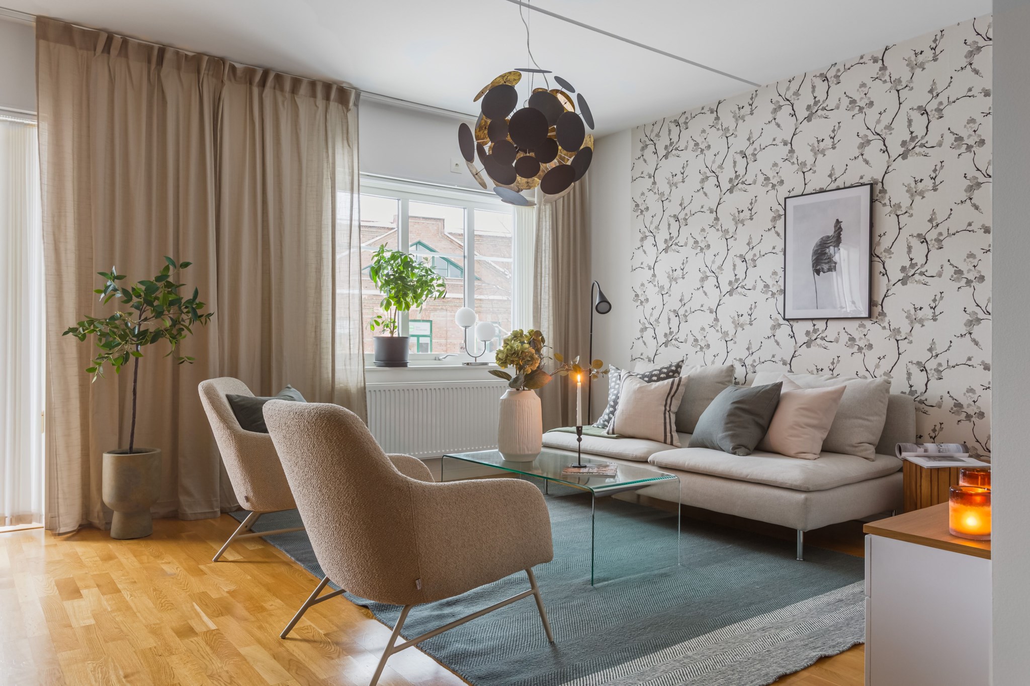 Ekparkett och ljusmålade väggar med tapetserad fondvägg. Plats för soffgrupp och TV-möbel. Utgång till altanen.