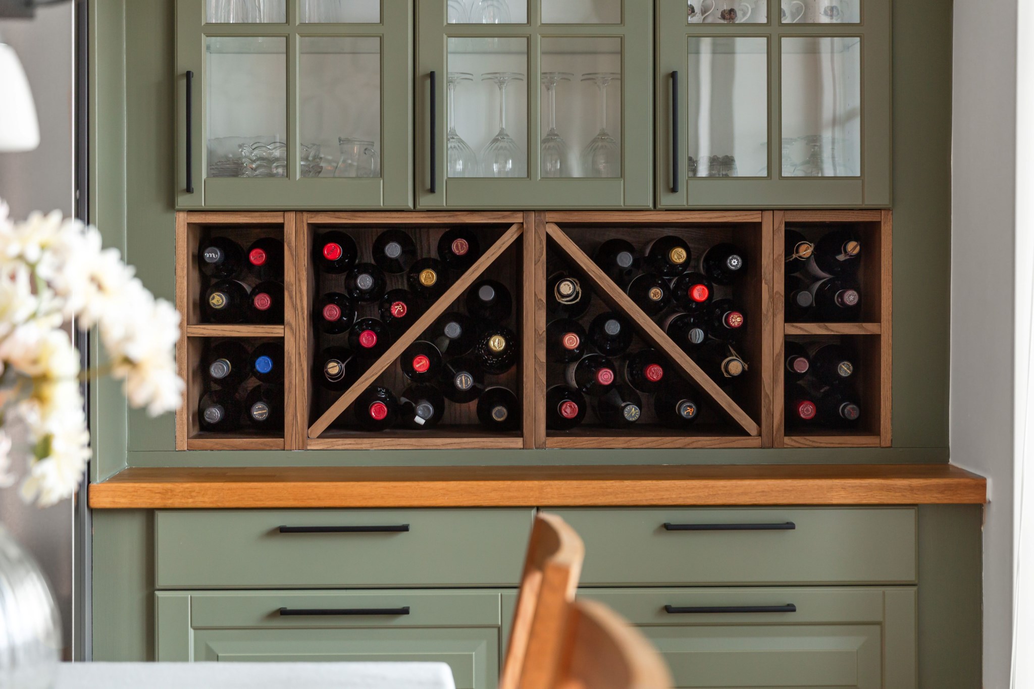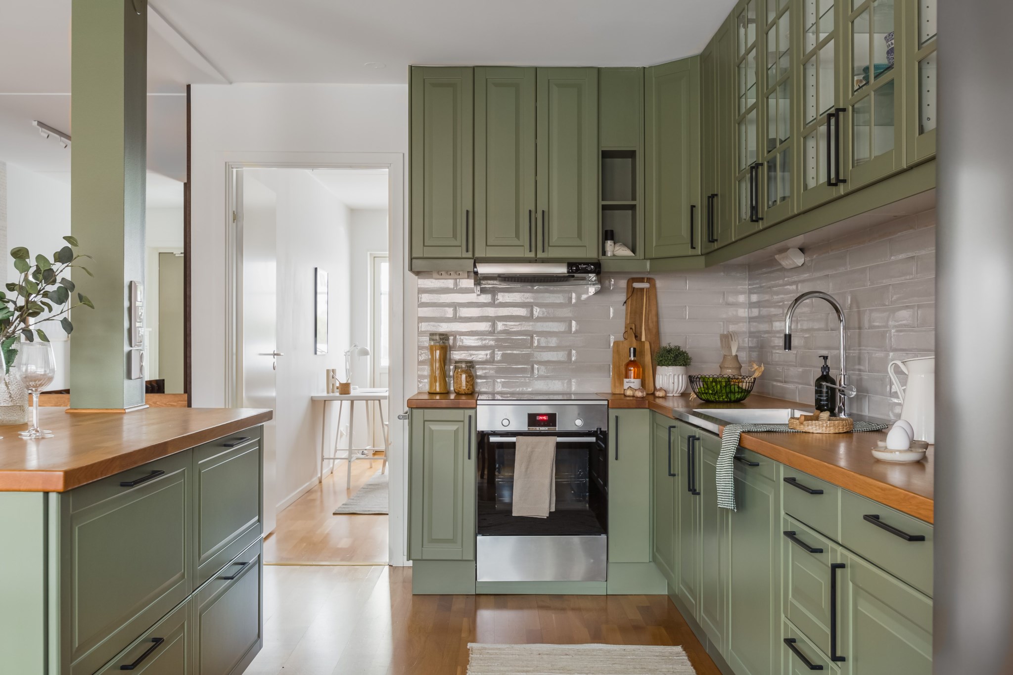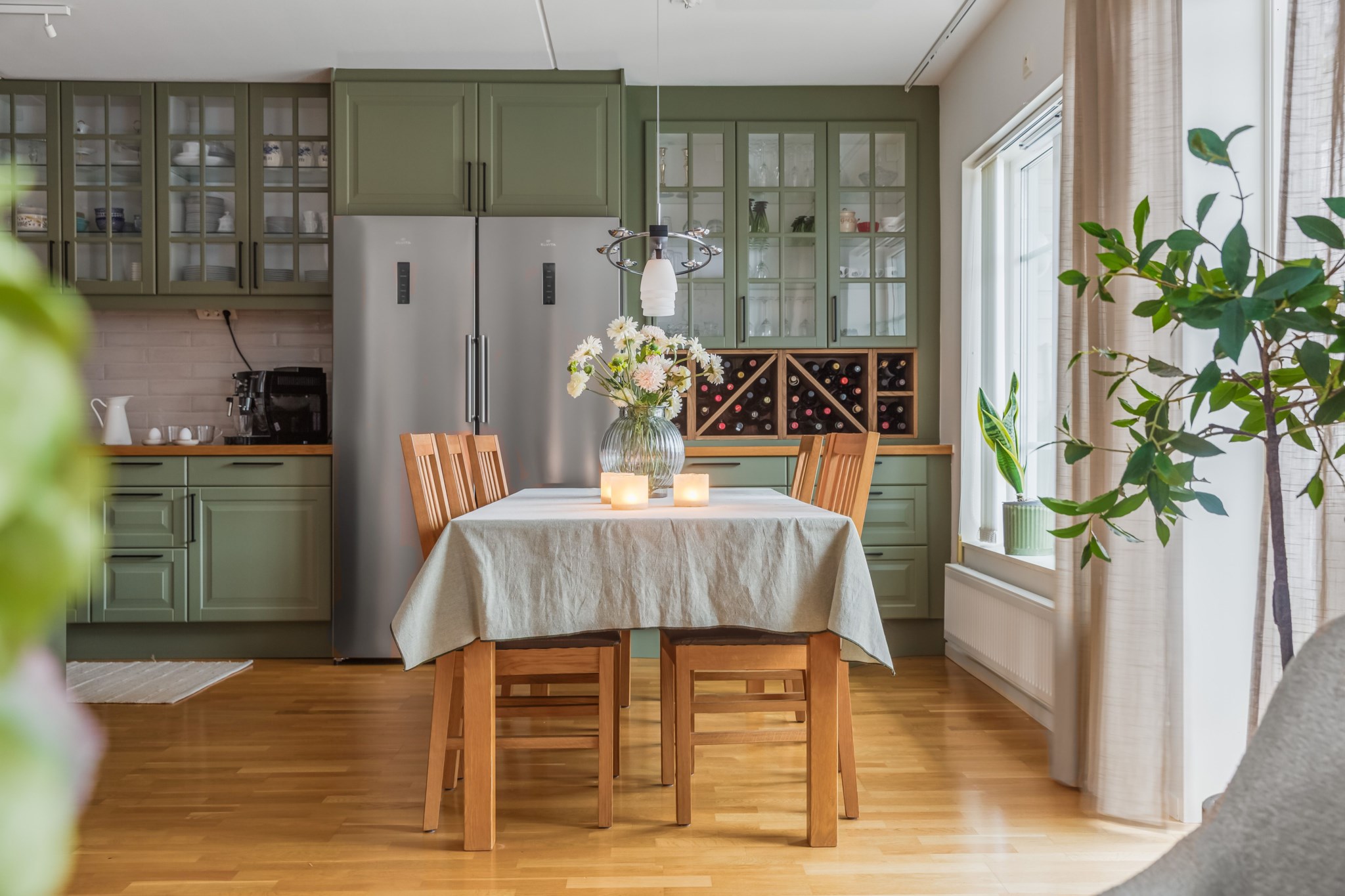 Ekparkett och ljusmålade väggar. Kök i neutral grön nyans med massiva köksbänkskivor och ovan det sitter vitt rektangulärt kakel. Köket är utrustat med diskmaskin, fullstort kyl och frys, induktionsspisarna med varmluftsugn och fläktkåpa. Mycket bra förvaring i kök och köksö. Köket har kompletterats med extra skåp, vinhyllor och vitrinskåp. Matplats för 6 personer.