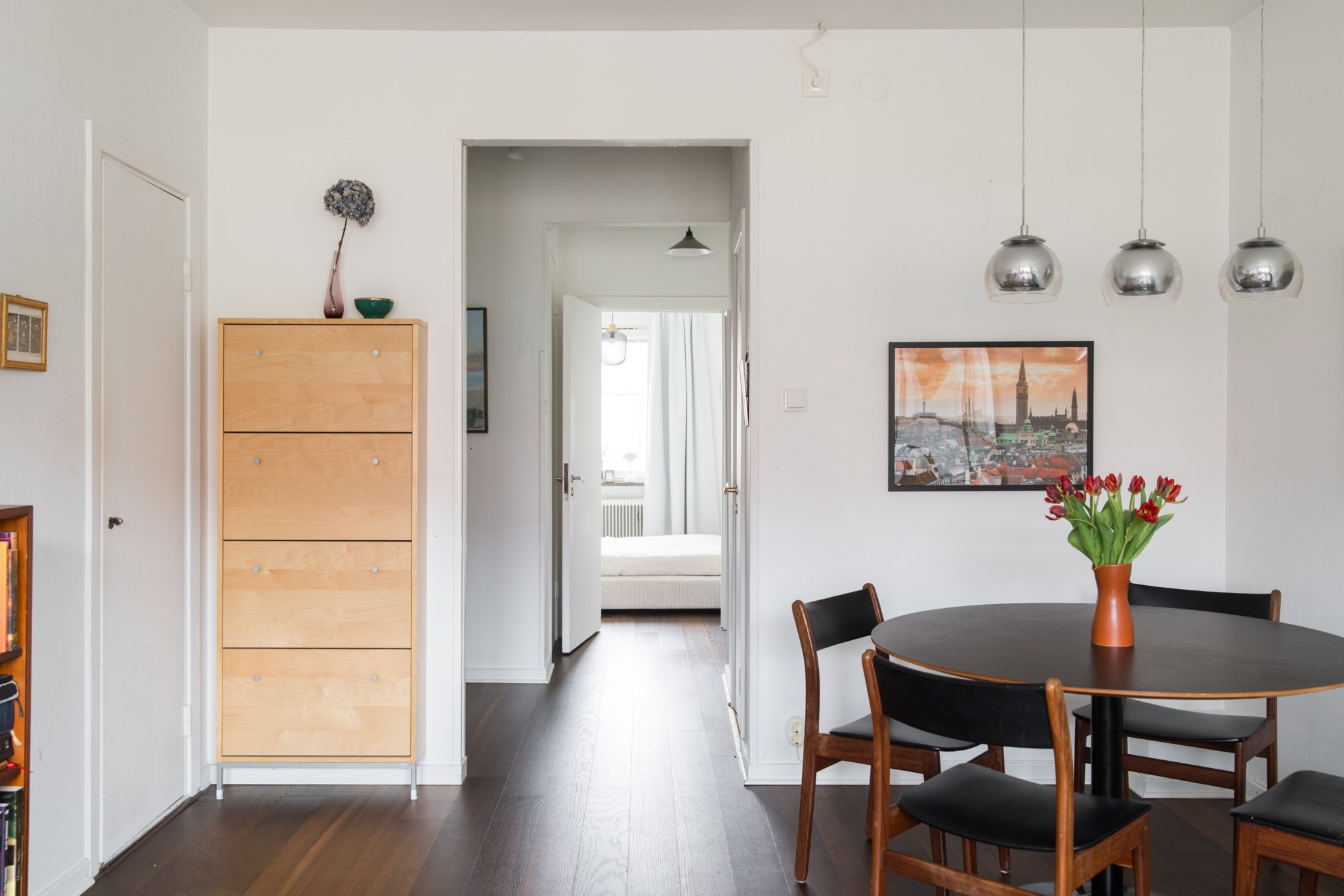 Parkettgolv och ljusmålade väggar. Möblerbar hall med plats för avhängning och förvaring i garderober. Hallen fungerar som en tydlig entré till bostaden och binder samman planlösningen på ett praktiskt sätt.