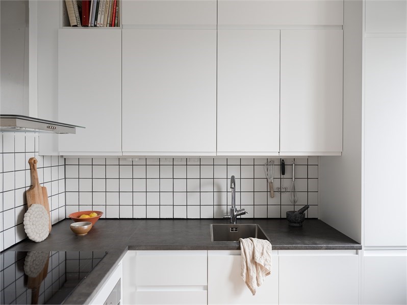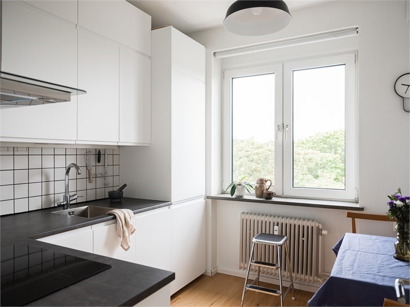Parkettgolv och ljusmålade väggar med kakel ovan arbetsytor. Köket är inrett med vita skåpsluckor och mörk bänkskiva, utrustat med spishäll, ugn, fläkt, kyl/frys samt diskmaskin. Intill fönstret finns plats för matbord för två till fyra personer med utsikt mot grönska.