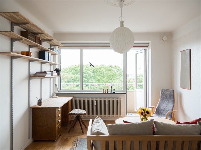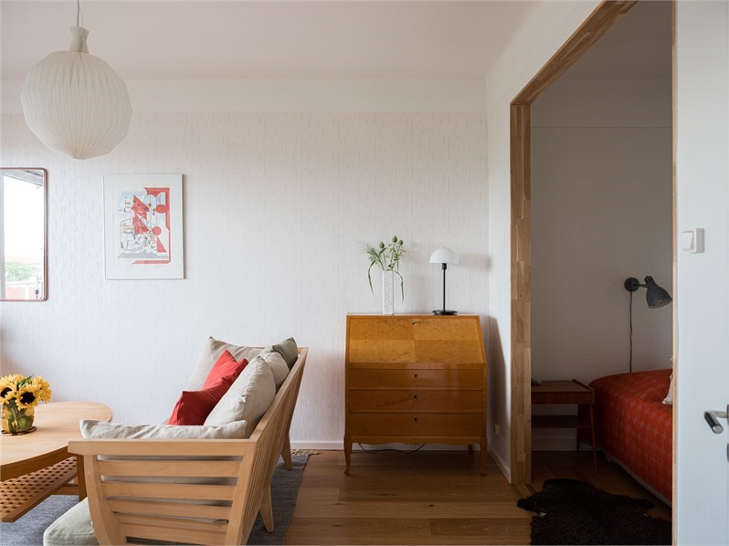 Parkettgolv och ljusmålade väggar. Rummet erbjuder god plats för soffgrupp, tv-möbel och arbetsplats. Den avskilda sovdelen rymmer säng och kompletterande möblering. Stora fönsterpartier ger ett generöst ljusinsläpp och härifrån nås balkongen.