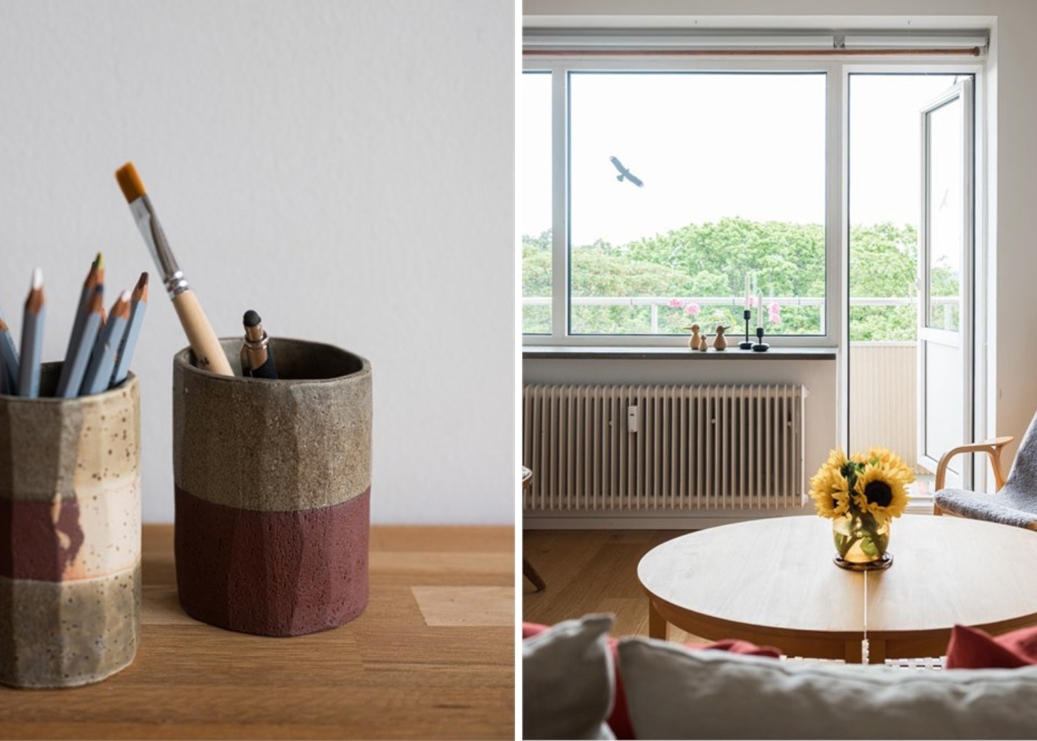 Balkongen vetter mot grönska och erbjuder plats för mindre möbelgrupp, med ett fritt och rofyllt läge högt över marken.