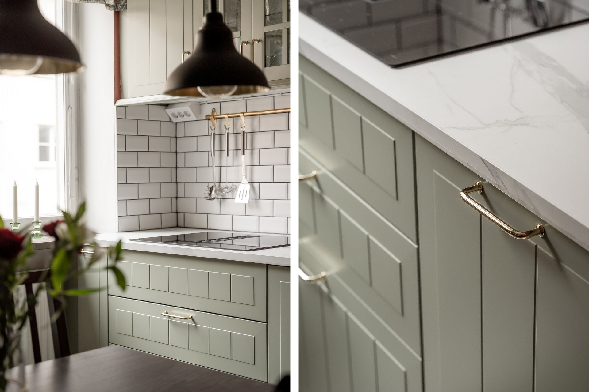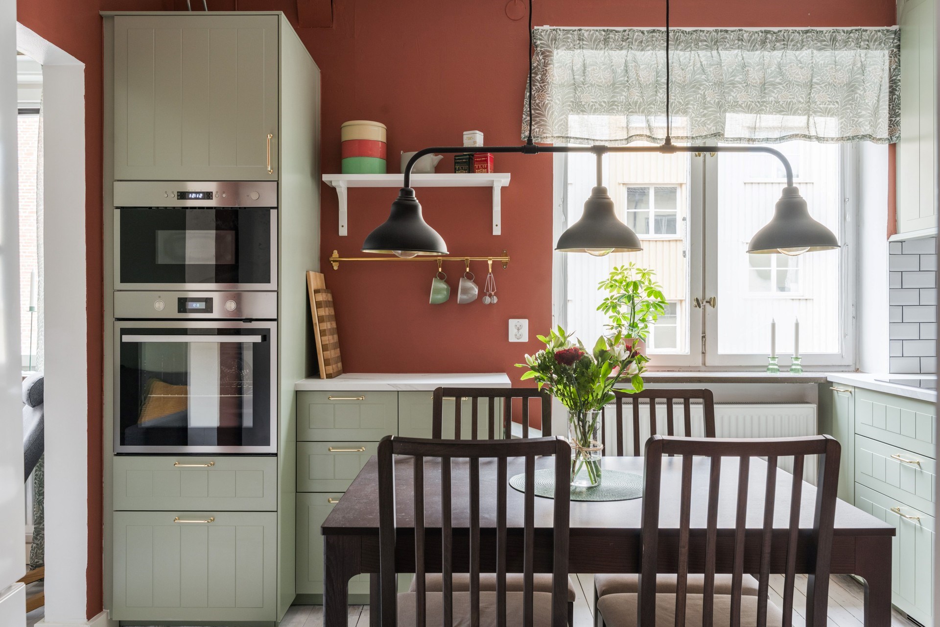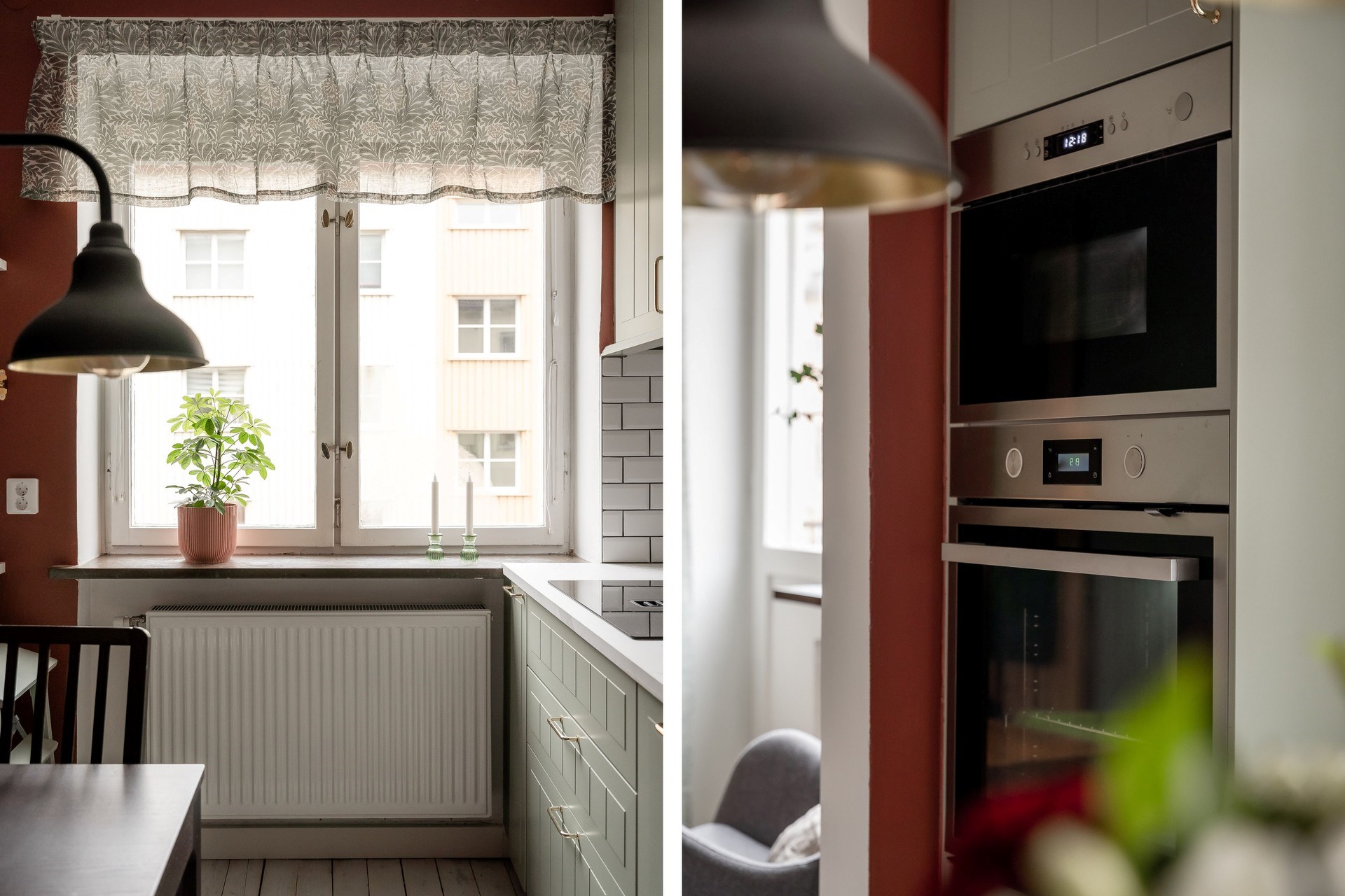 Köket ligger i direkt anslutning till vardagsrummet och har renoverats med kvalitativa materialval. Renoveringen är genomförd med omsorg för bostadens karaktär och med hänsyn till fastighetens uttryck och områdets arkitektur. Resultatet är ett kök där funktion och material samspelar på ett naturligt sätt med goda arbetsytor, generös förvaring och plats för matbord.
