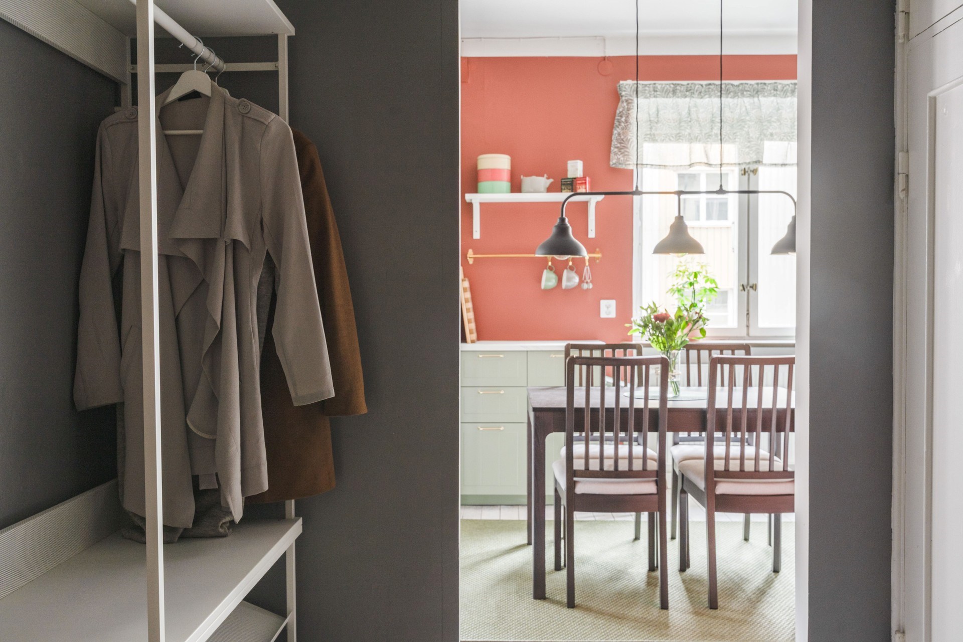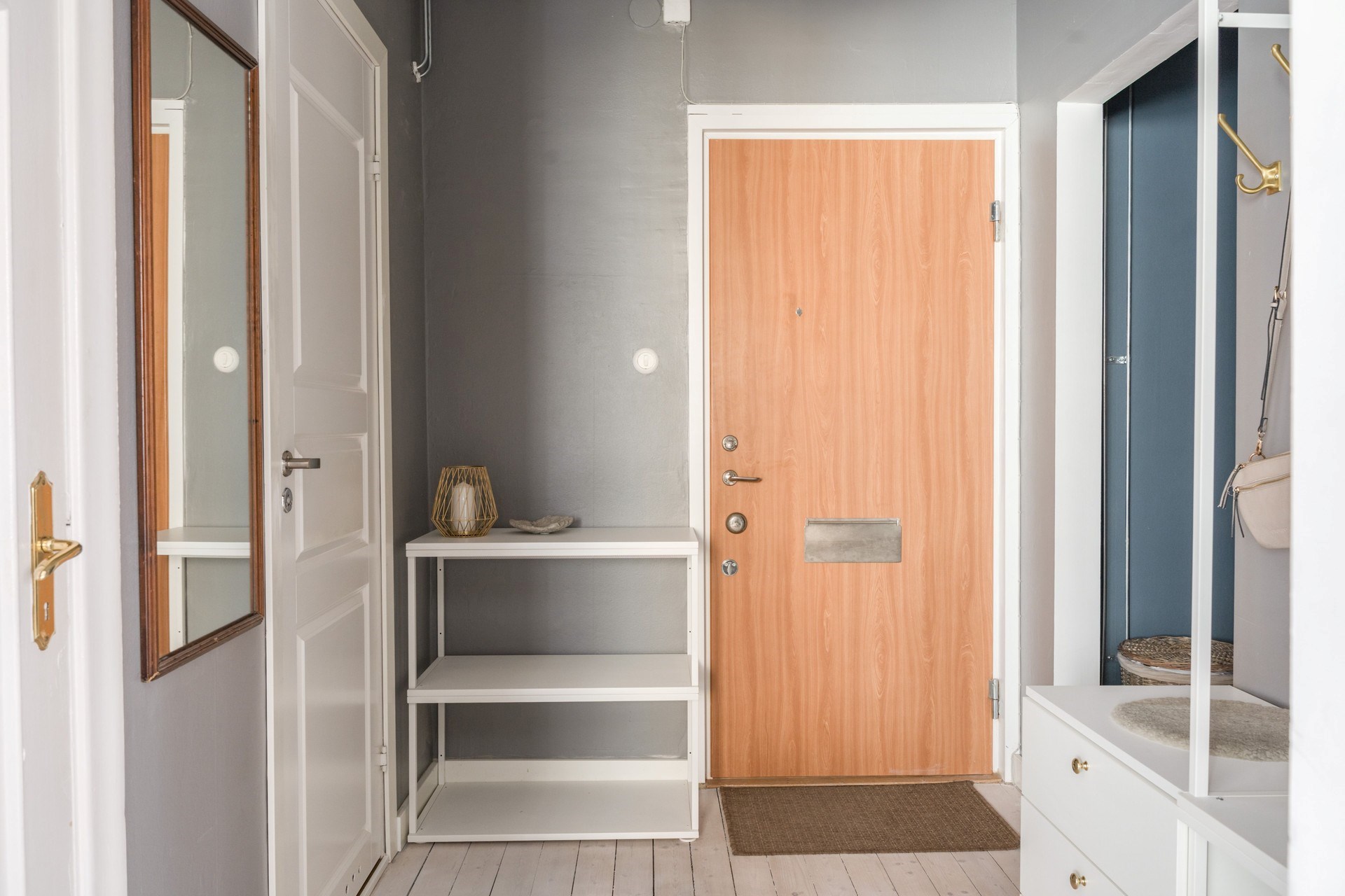 Vitmålat trägolv och gråmålade väggar. Hallen erbjuder plats för avhängning samt förvaring i garderob och utrymme för mindre möbel.