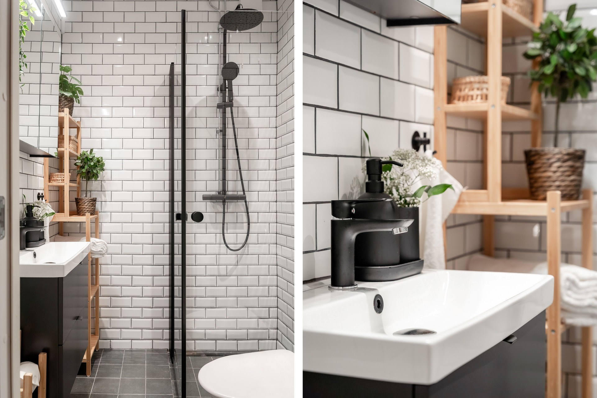 Badrummet har renoverats i samma genomtänkta stil med materialval och detaljer som samspelar med bostadens övriga uttryck. De klassiska ytskikten kombineras med moderna funktioner vilket ger ett praktiskt och sammanhållet badrum.