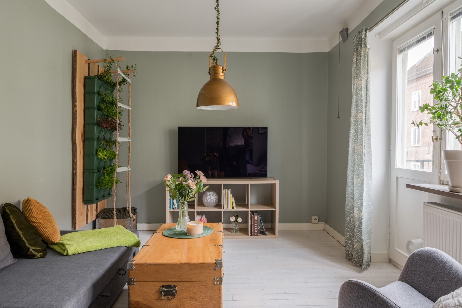 Vitmålat trägolv och målade väggar i ljus grön ton. Rummet erbjuder plats för soffgrupp, TV-möbel och ytterligare möblering. De stora fönstren ger ett naturligt ljusinsläpp som bidrar till rummets öppna känsla.