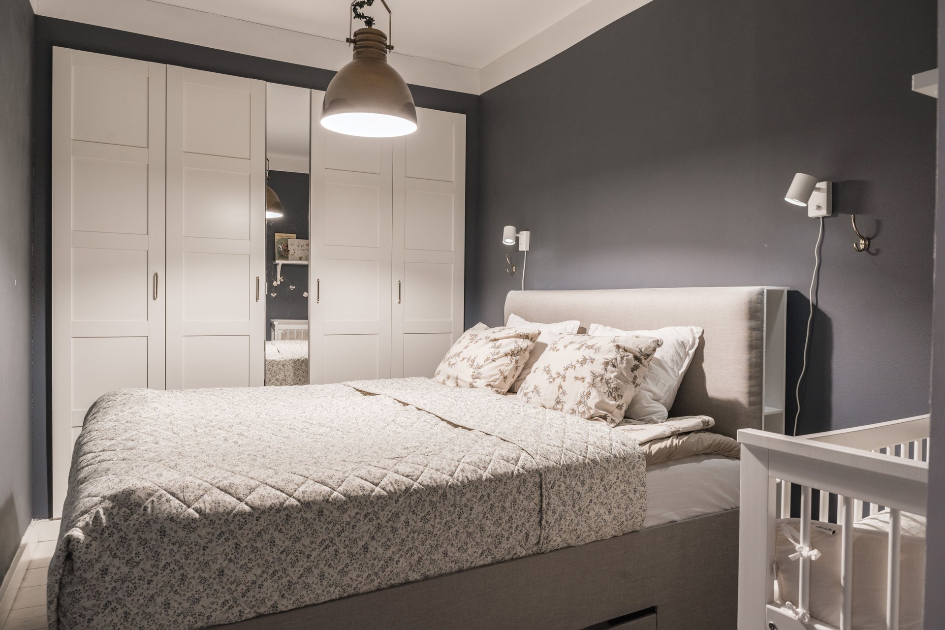 Vitmålat trägolv och mörkare målade väggar. Avskild sovdel med plats för säng samt förvaring i garderober längs väggen.