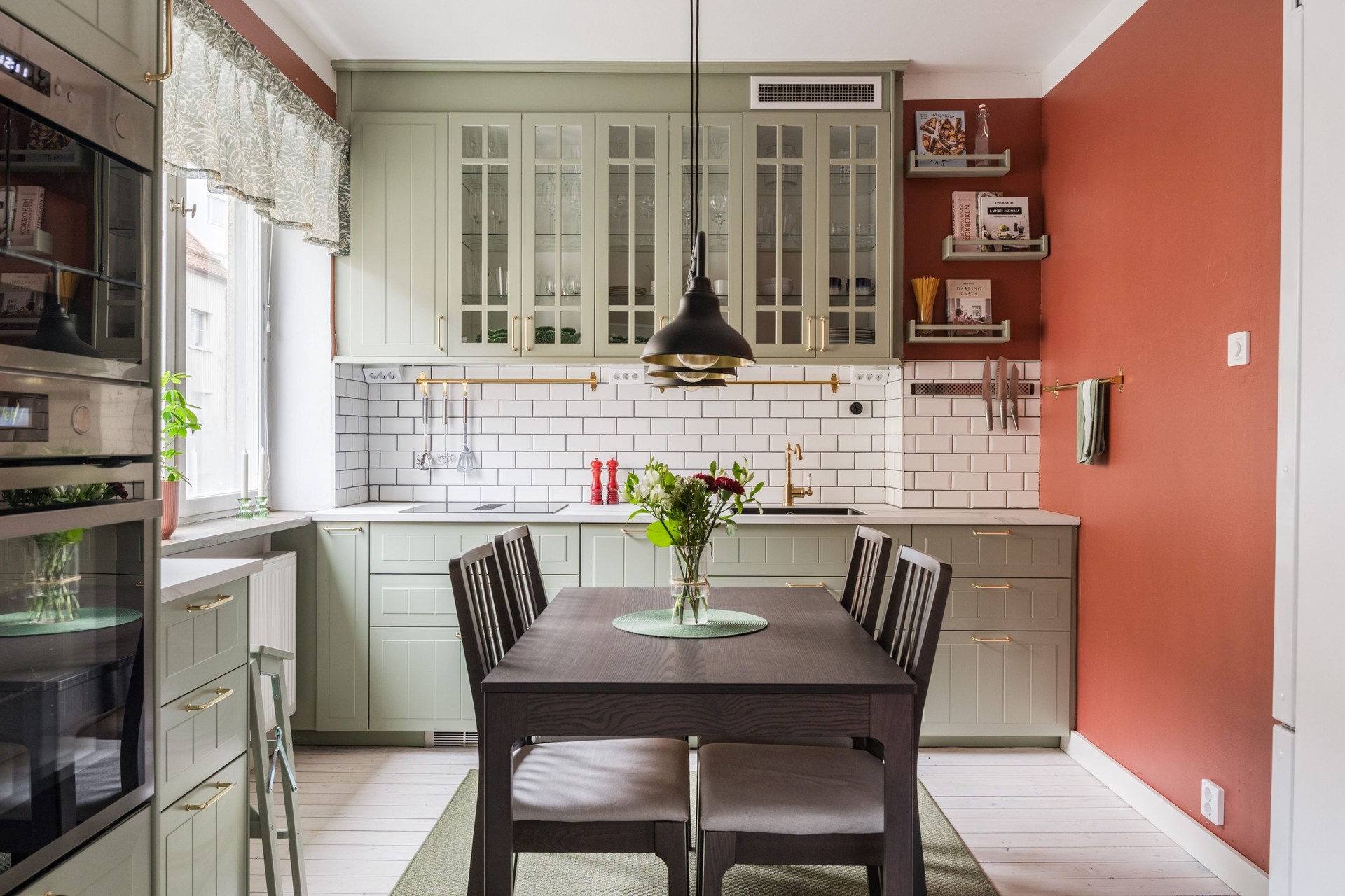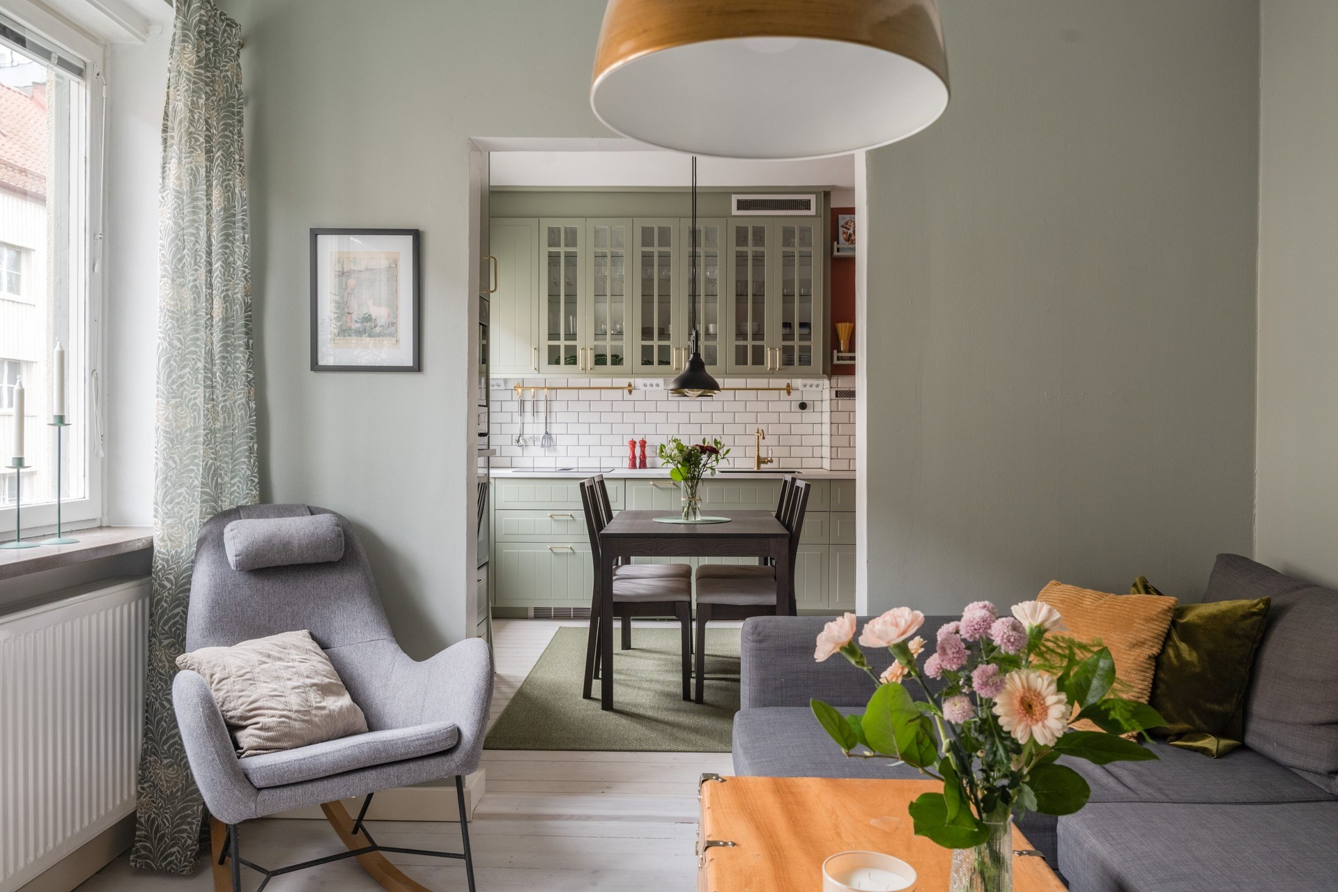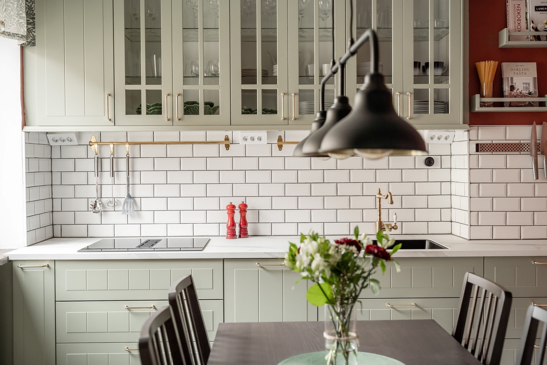 Vitmålat trägolv och målade väggar. Köksinredning i ljusgrön kulör med vitrinskåp och vitt kakel ovan arbetsytorna. Köket erbjuder god förvaring och arbetsyta samt plats för matbord.