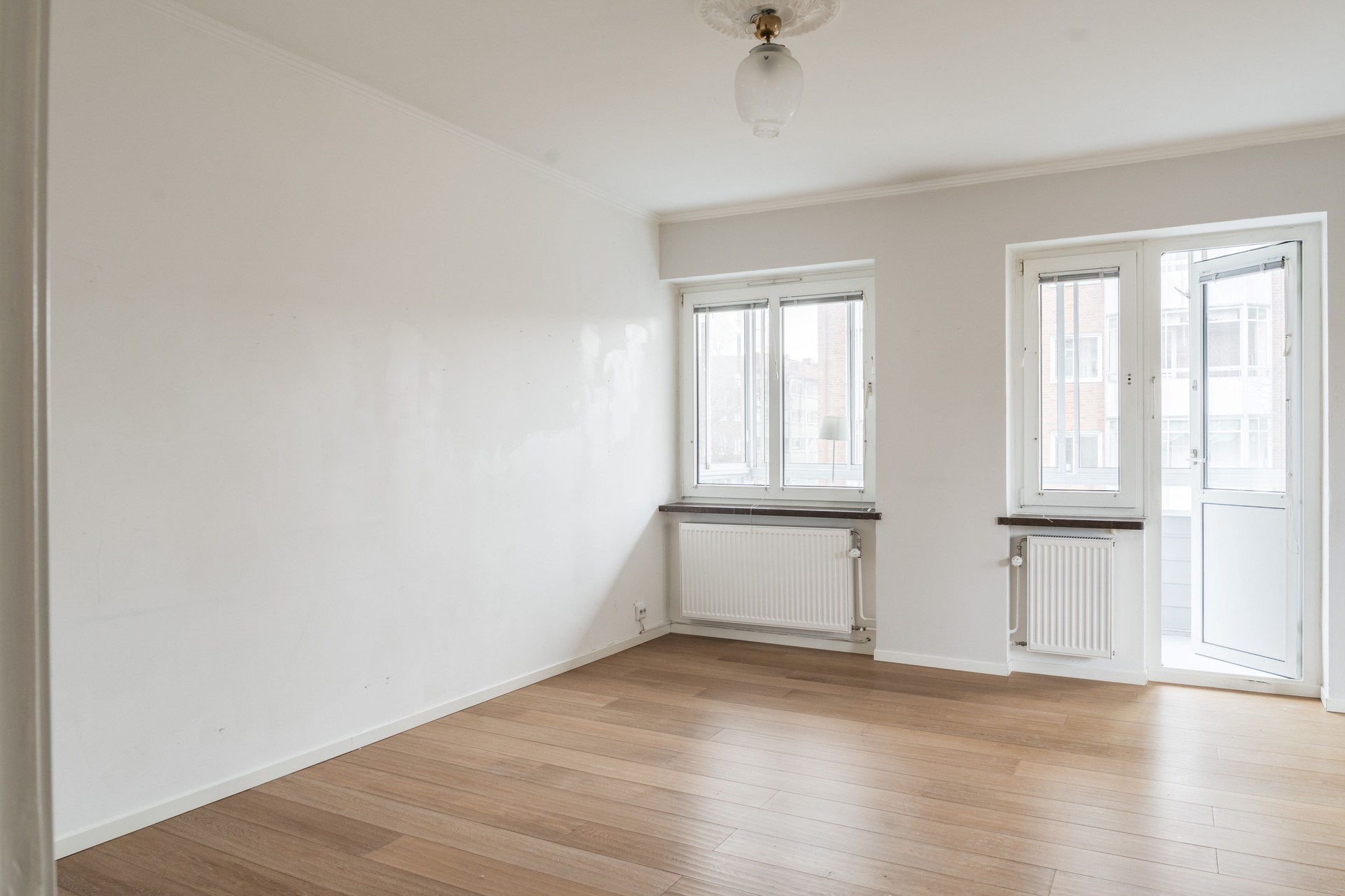 Parkettgolv och ljusa väggar. Rummet har generösa fönsterpartier och erbjuder plats för större soffgrupp samt matplats om så önskas. Utgång till den inglasade balkongen som fungerar som en förlängning av vardagsrummet.
