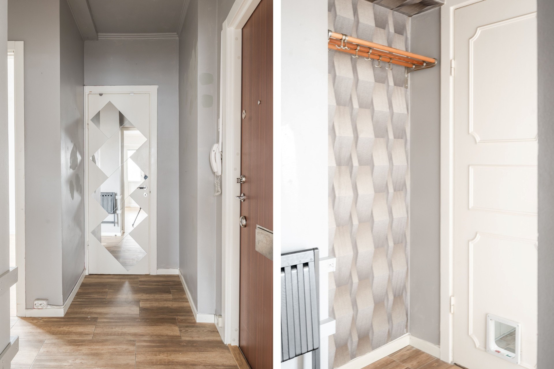 Ljust golv och ljusa väggar. Hallen är centralt placerad i bostaden och erbjuder plats för avhängning samt förvaring i angränsande klädkammare, vilket skapar en praktisk och välkomnande entré.