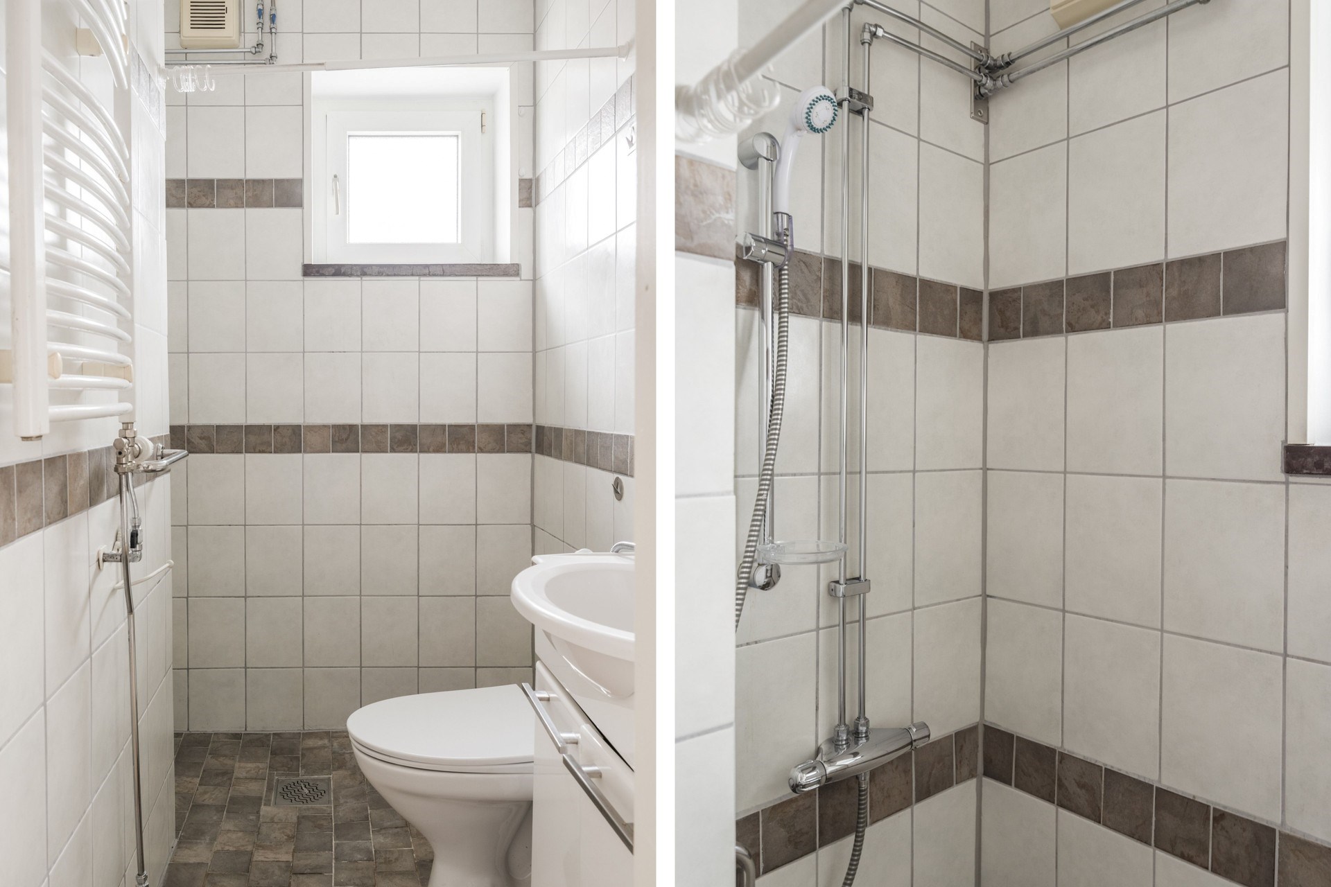 Klinkergolv och helkaklade väggar i ljus kulör med mörkare dekorlist. Badrummet är utrustat med WC, handfat med kommod, spegelskåp, handdukstork samt duschhörna.