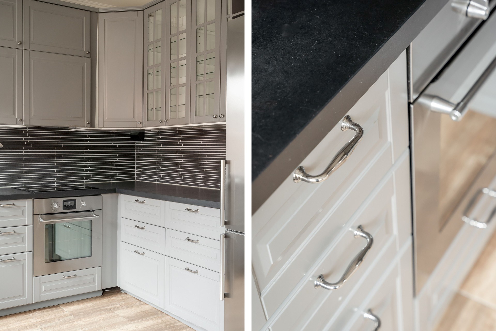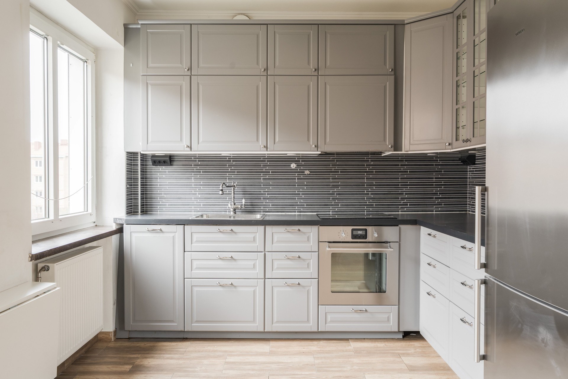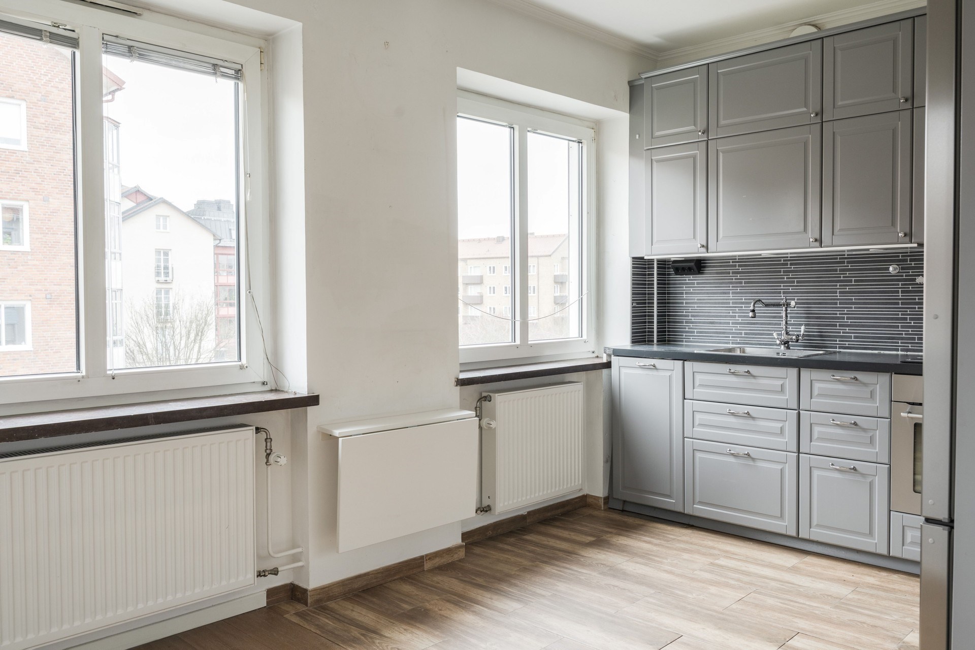 Träliknande golv och ljusa väggar. Köksinredning i grå ton med mörk bänkskiva och kaklat stänkskydd i avlångt format. Köket är utrustat med spishäll, inbyggd ugn, fläkt, diskmaskin samt kyl och frys. Här finns plats för matbord vid fönster med fint ljusinsläpp.