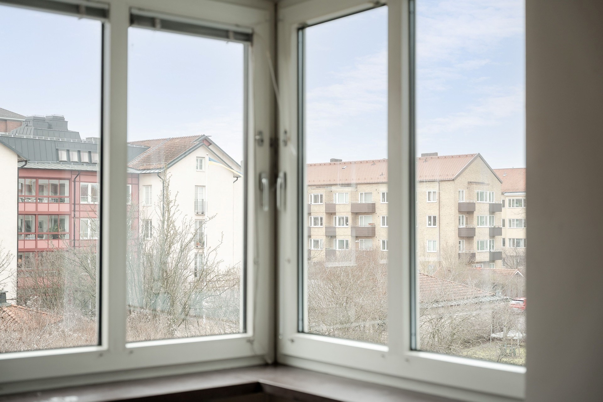 Parkettgolv och ljusa väggar. Sovrummet rymmer dubbelsäng och har plats för kompletterande förvaring. Fönster i vinkel ger ett fint ljusinsläpp och utsikt mot området.