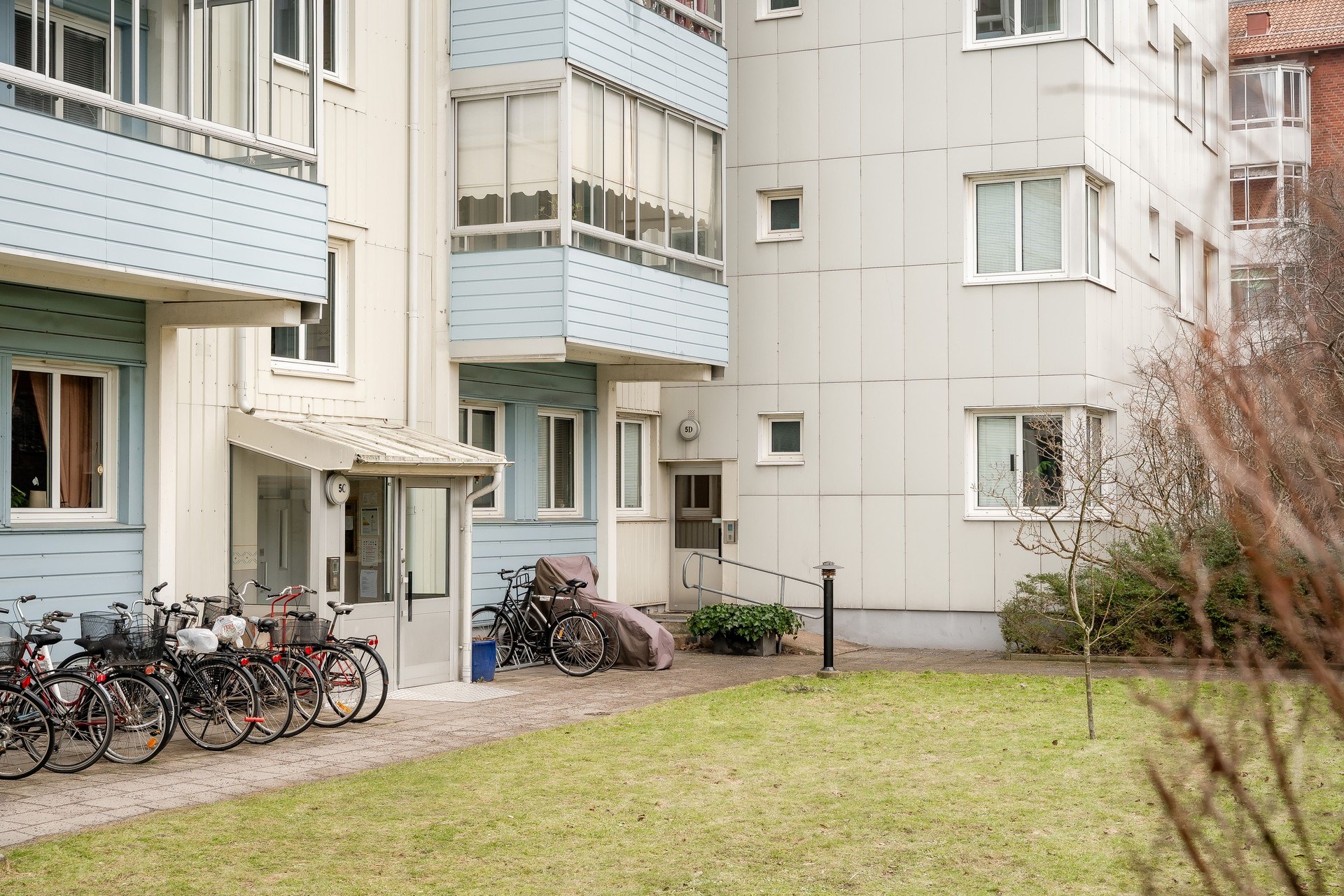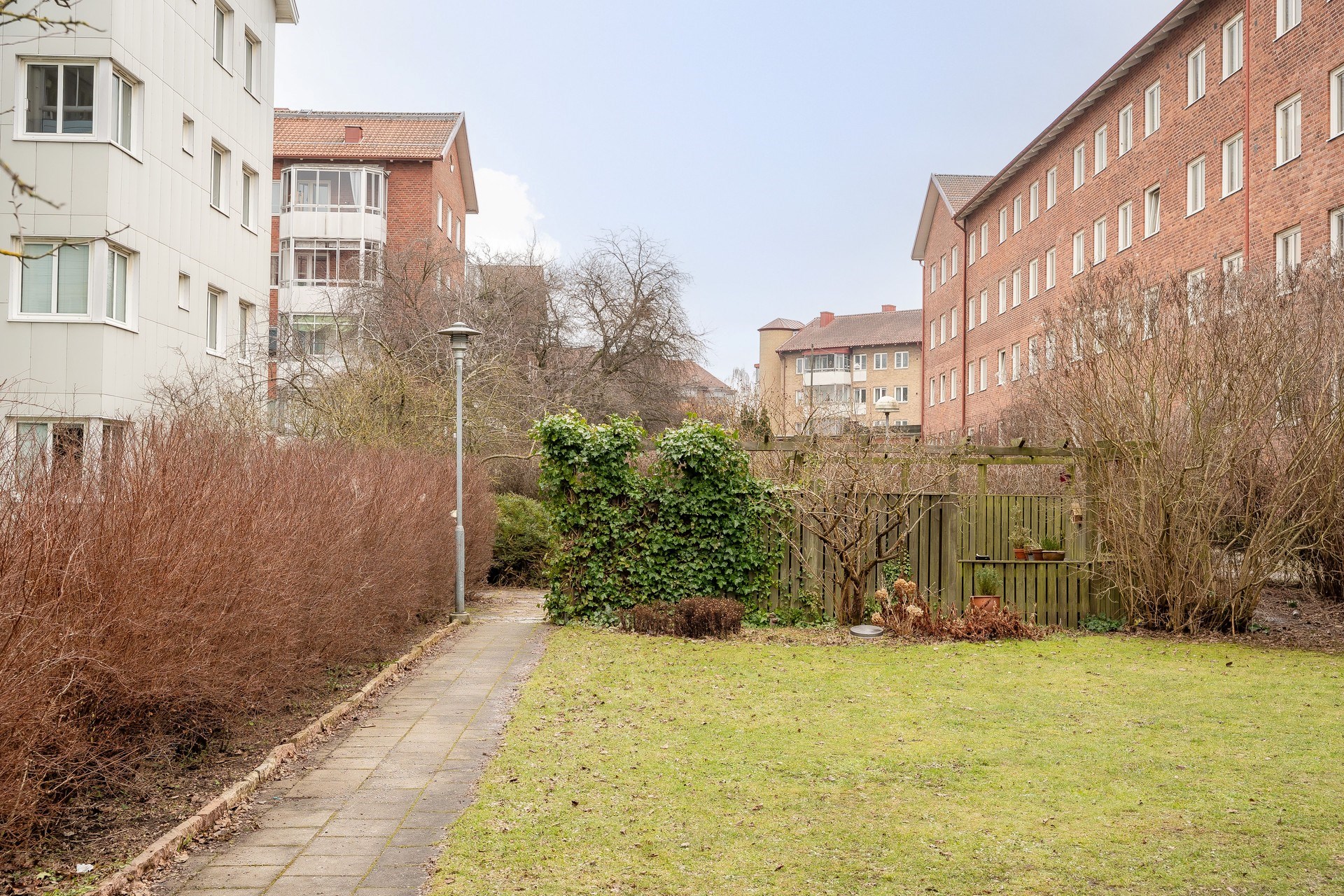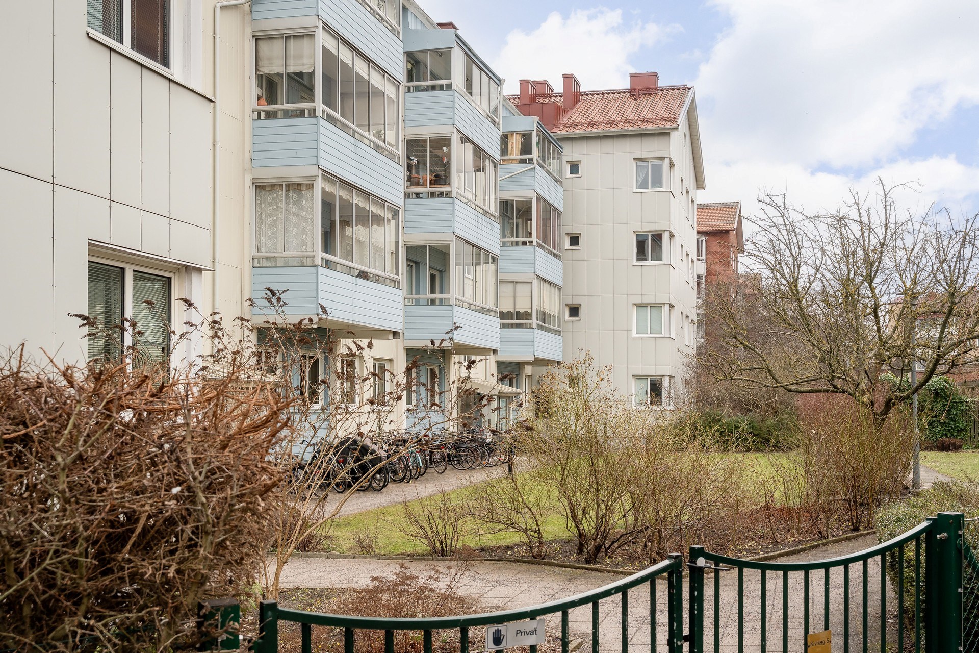 Fastigheten erbjuder en lugn boendemiljö med innergård och grönska mellan husen.