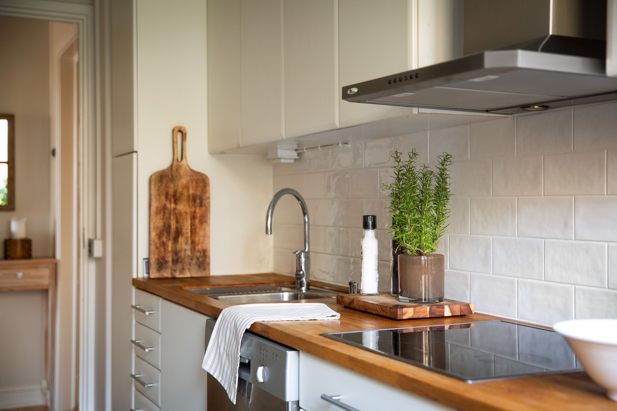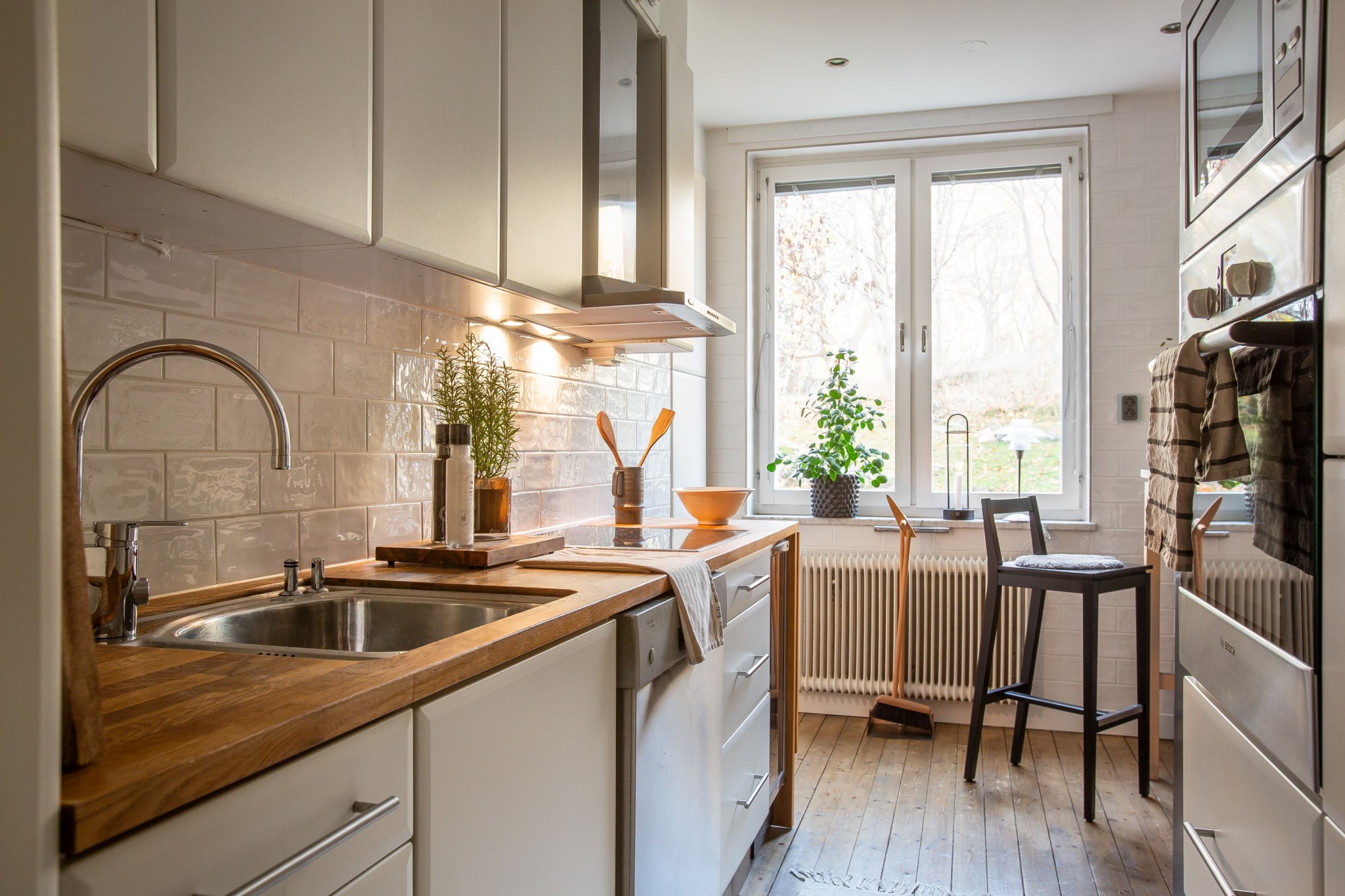 Parkettgolv och kaklade väggar. Härjedalskök i vitt och ovan det massiv trä-bänkskiva. Köket är utrustat med induktionshäll (Bosch), inbyggd ugn (Bosch), inbyggd micro (Bosch), köksfläkt, kyl och frys (Samsung) samt diskmaskin (Bosch). Plats för matbord.
