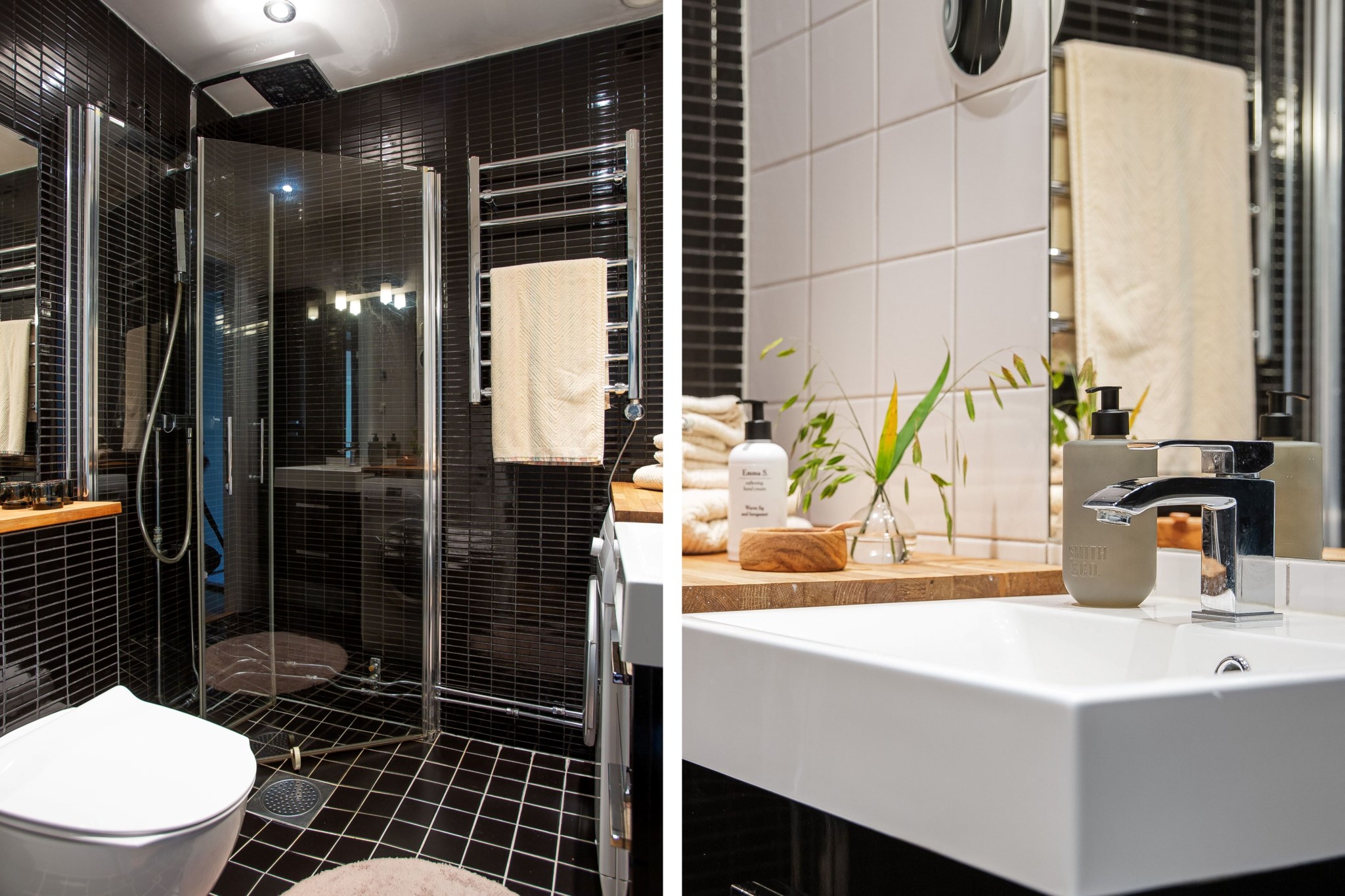 Helkaklat badrum i svart och vitt med golvvärme. Badrummet är utrustat med väggmonterad WC, handfat med kommod, spegel, tvättmaskin (Siemens) och handdukstork. Spotlight i taket.
