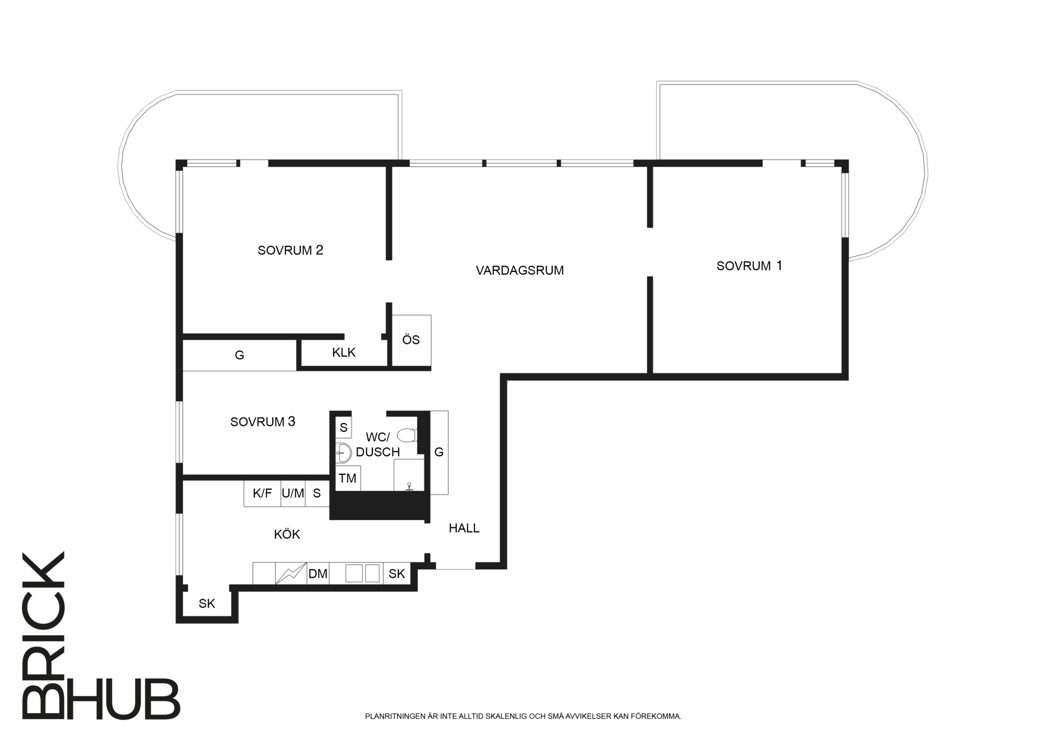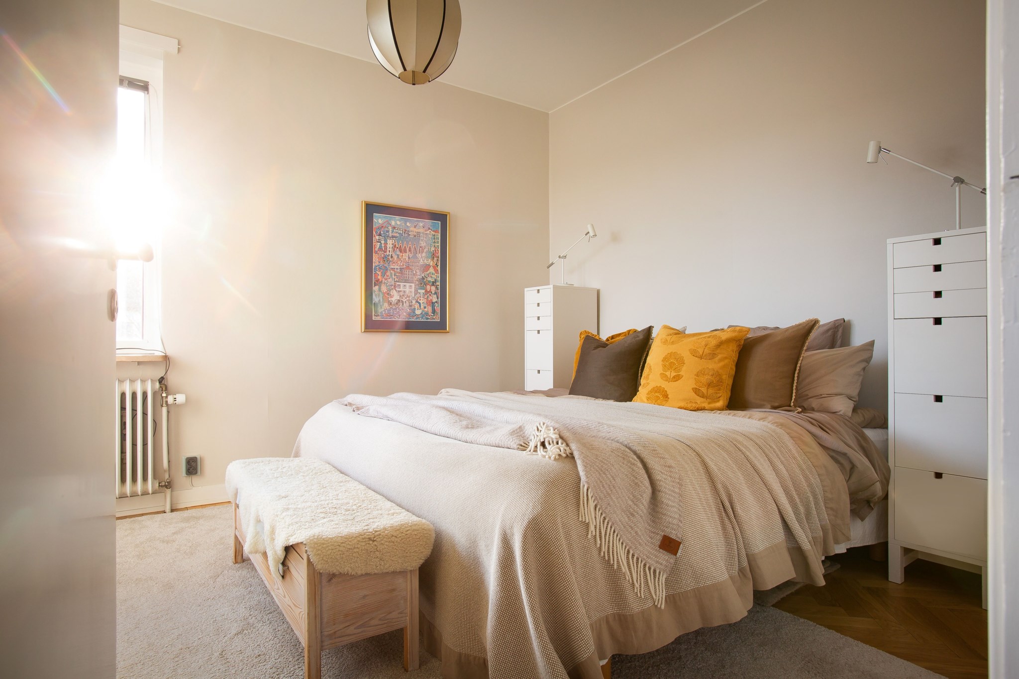 Fiskbensparkett och ljusmålade väggar. Plats för dubbelsäng med sängbord eller Soffgrupp och läshörna. Utgång till den andra hörnbalkongen.