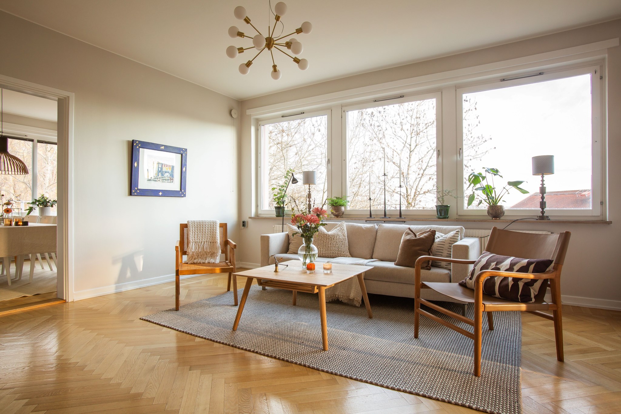 Fiskbensparkett och ljusmålade väggar. Plats för stor soffgrupp och TV-möbel. Den öppna spisen är i bruk.