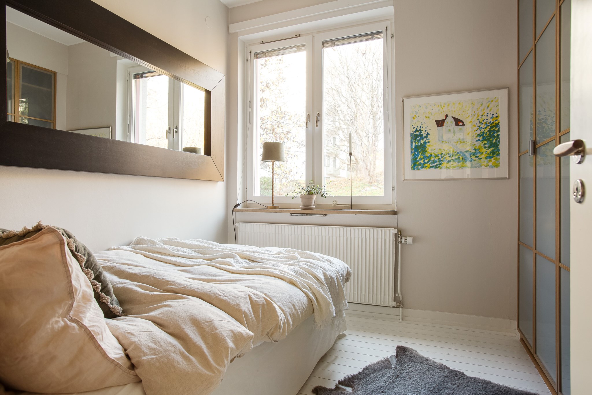 Vit plankgolv och målade väggar. Plats för säng och sängbord. Förvaring i skjutdörrsgarderob.