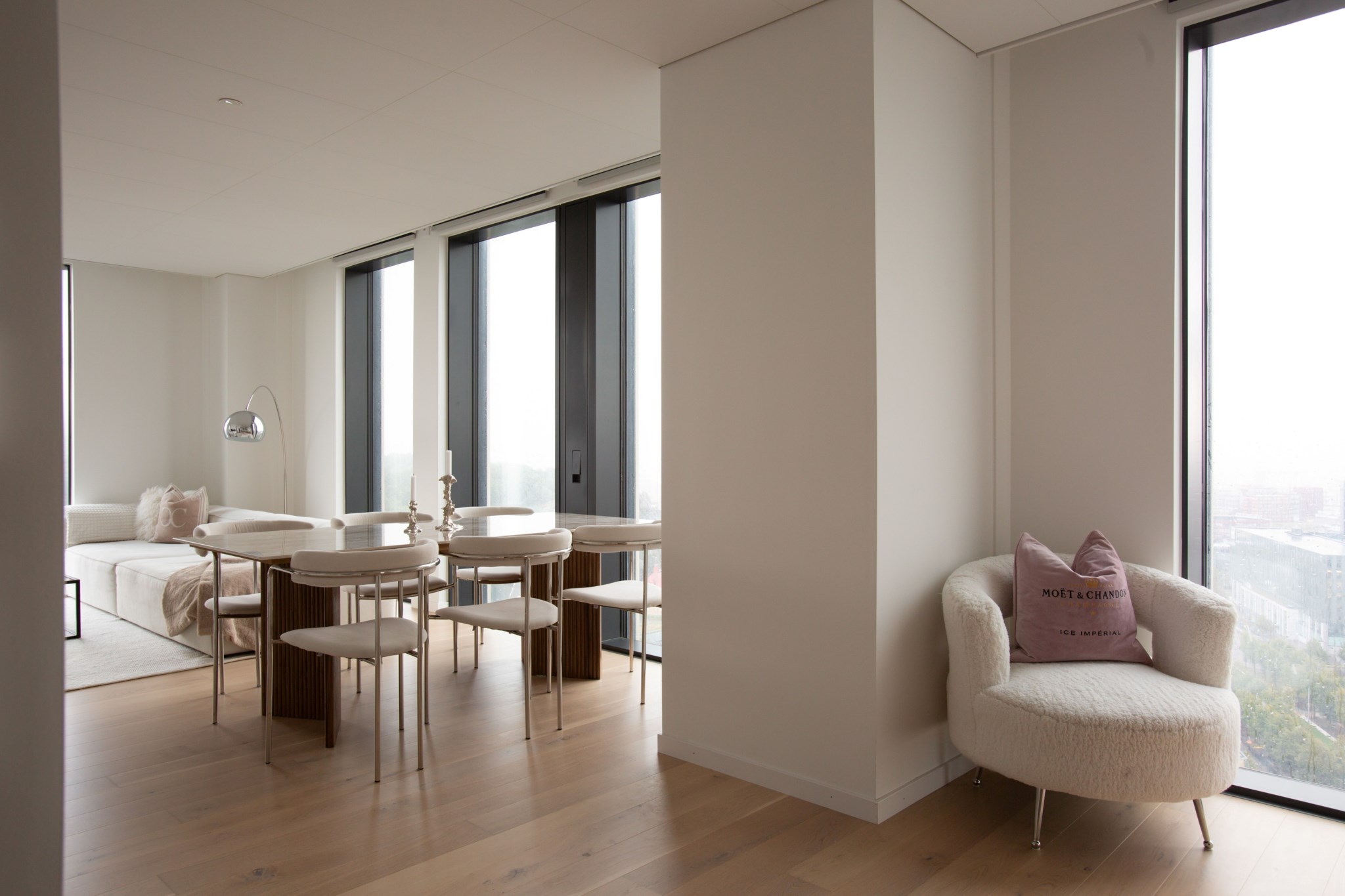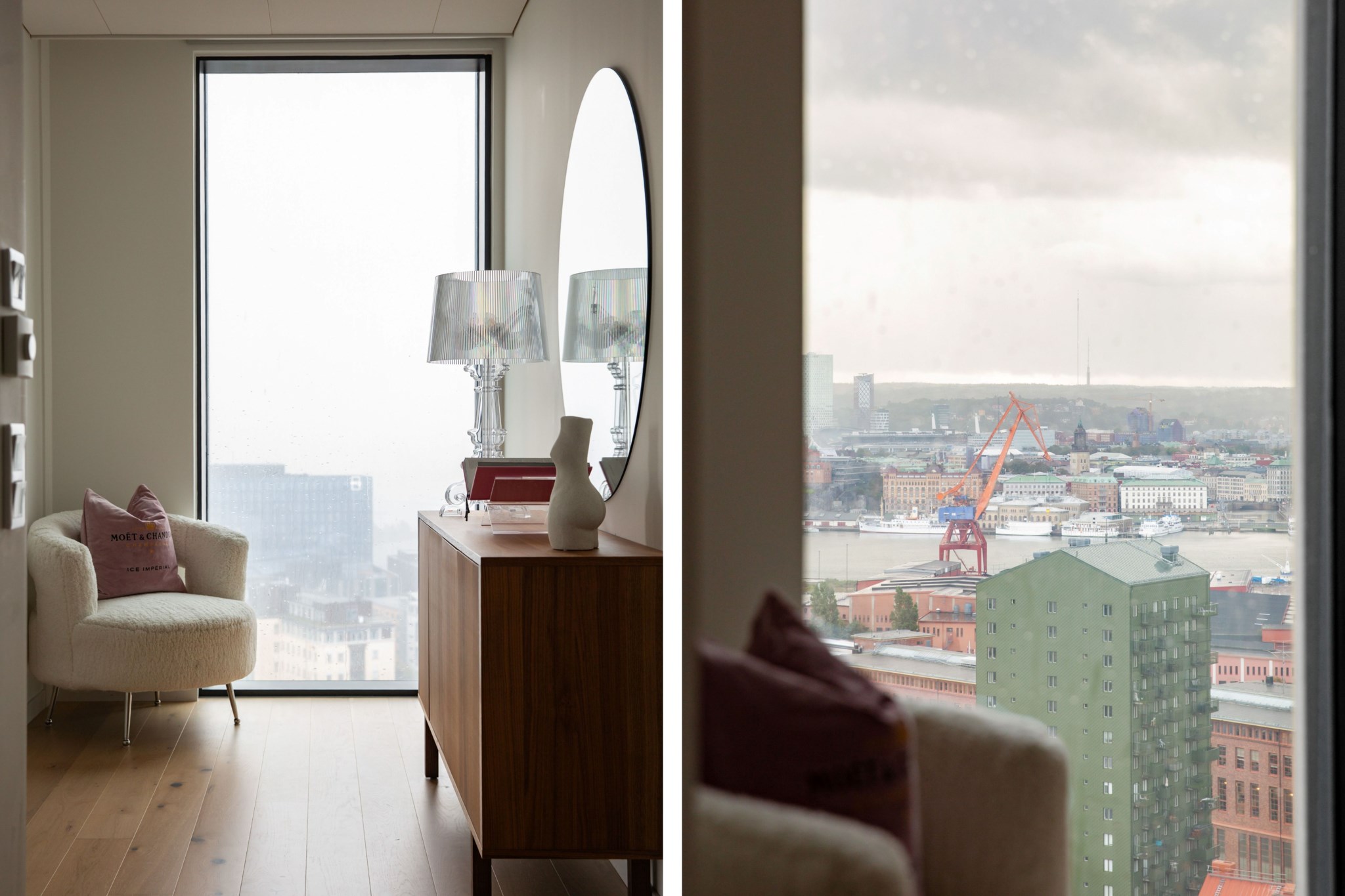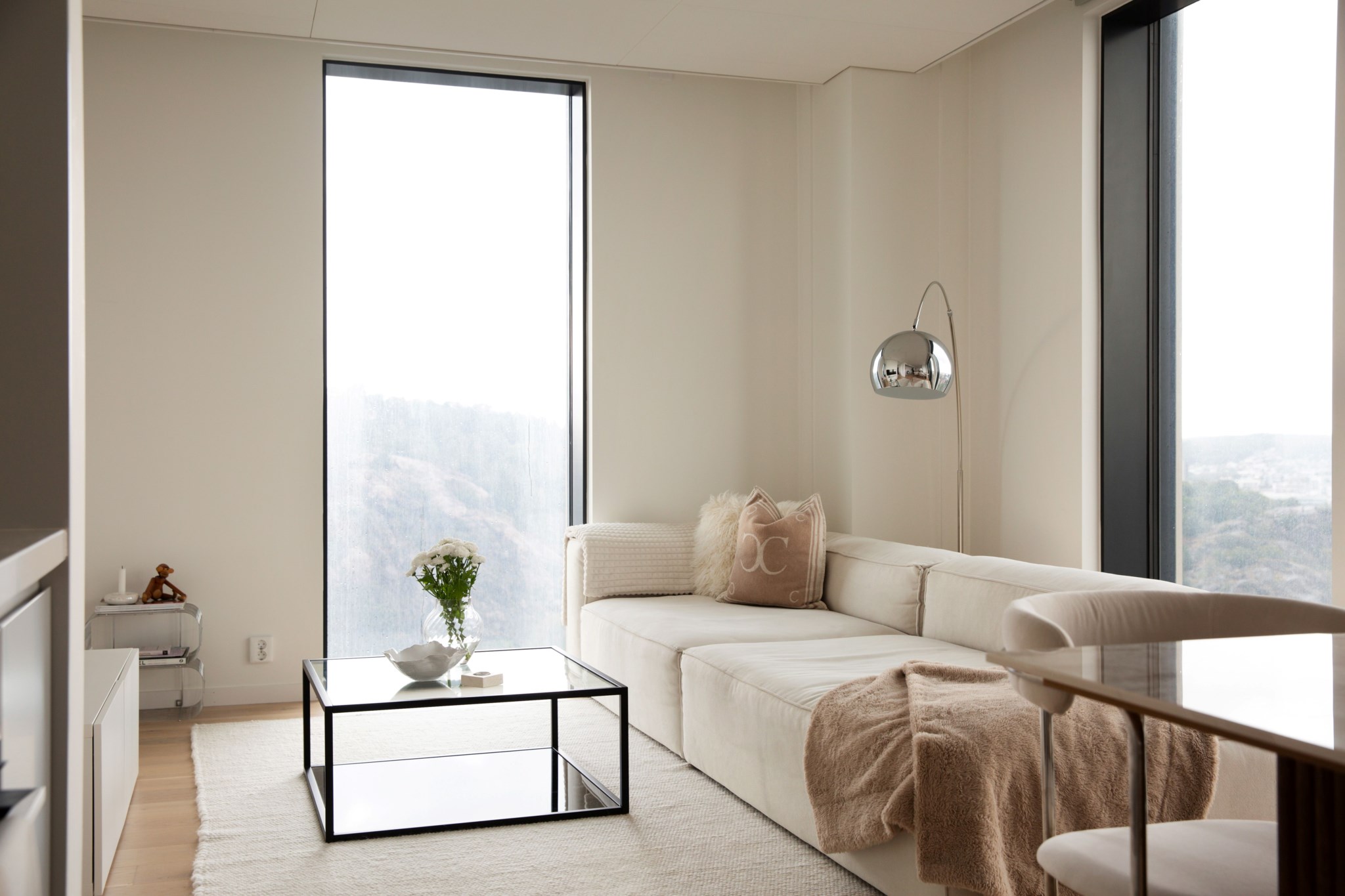 Ekparkett och ljusmålade väggar. Plats för soffgrupp och TV-möbel. Utsikten är i rätt läge med älven och centrala Göteborg.