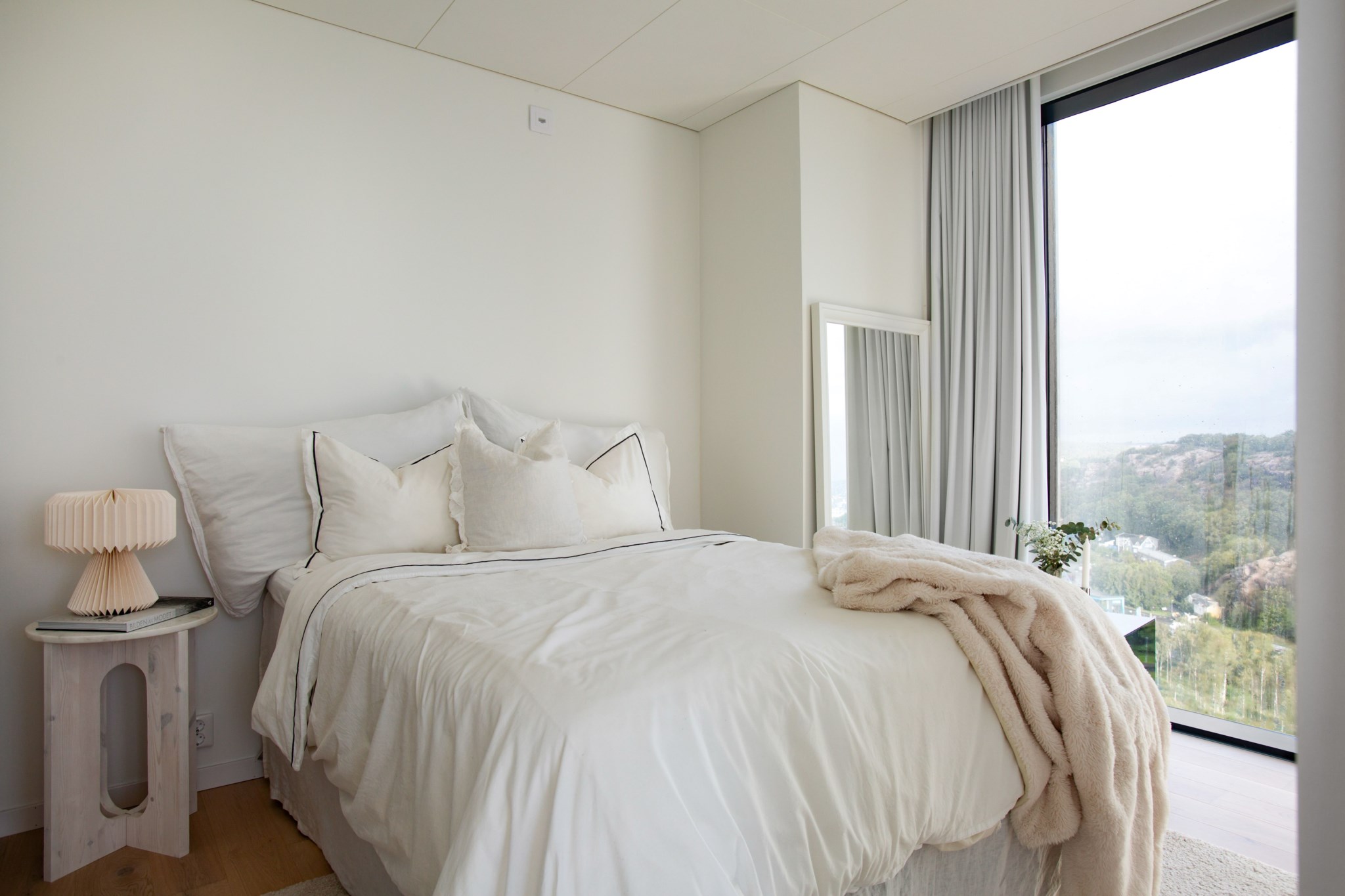Ekparkett och ljusmålade väggar. Plats för dubbelsäng med tillhörande sängbord. Utsikt över ramberget vilket innebär att solen inte värmer upp sovrummet inför kvällen.