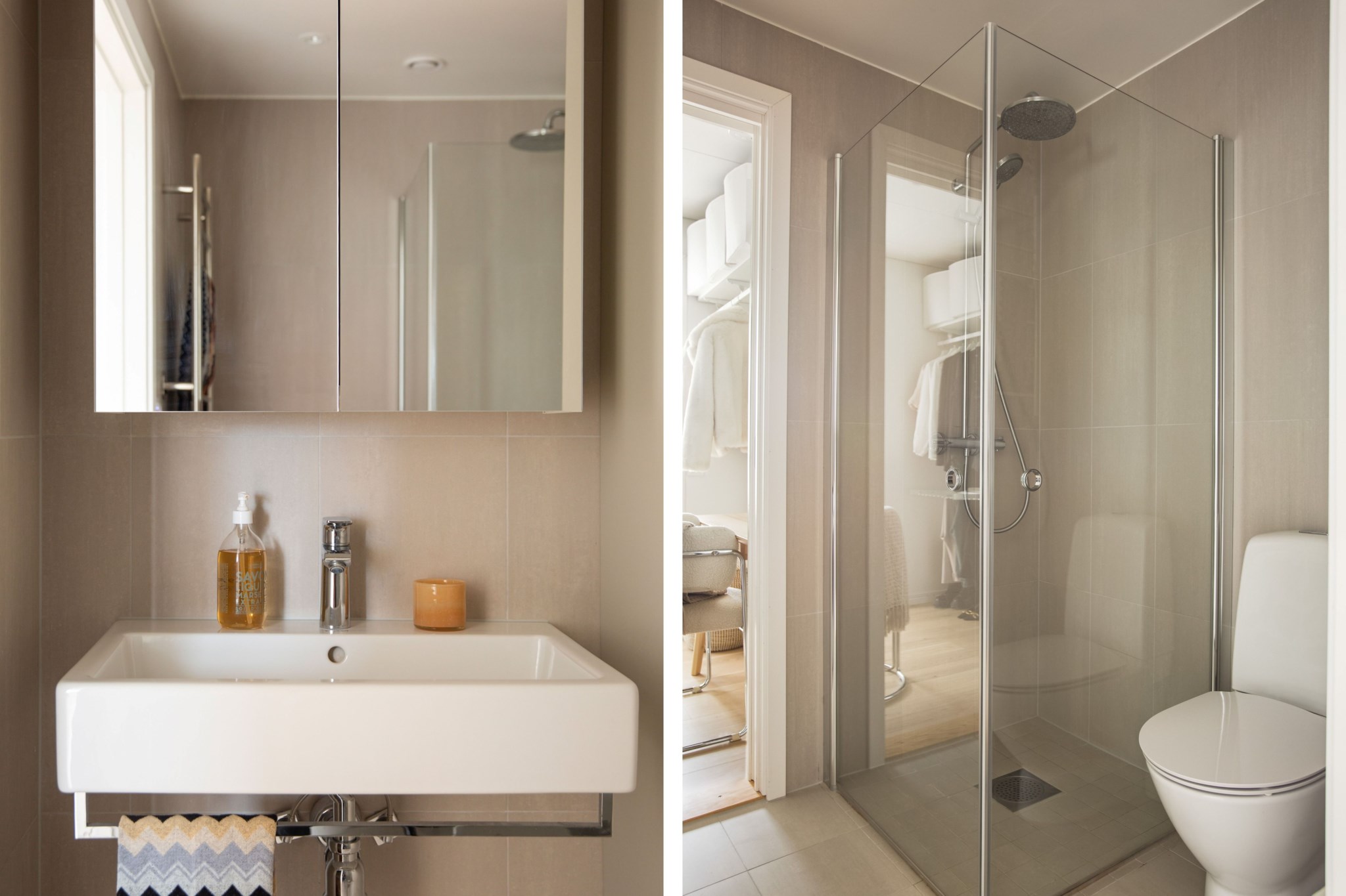 Ljusgrått klinkergolv med golvvärme och helkaklade väggar i samma färg. Badrumsinredningen består av WC, handfat med handdukshängare, spegelskåp med belysning, dusch med vikbara glasväggar, handdukstork samt kombinerad tvättmaskin/torktumlare (Electrolux).