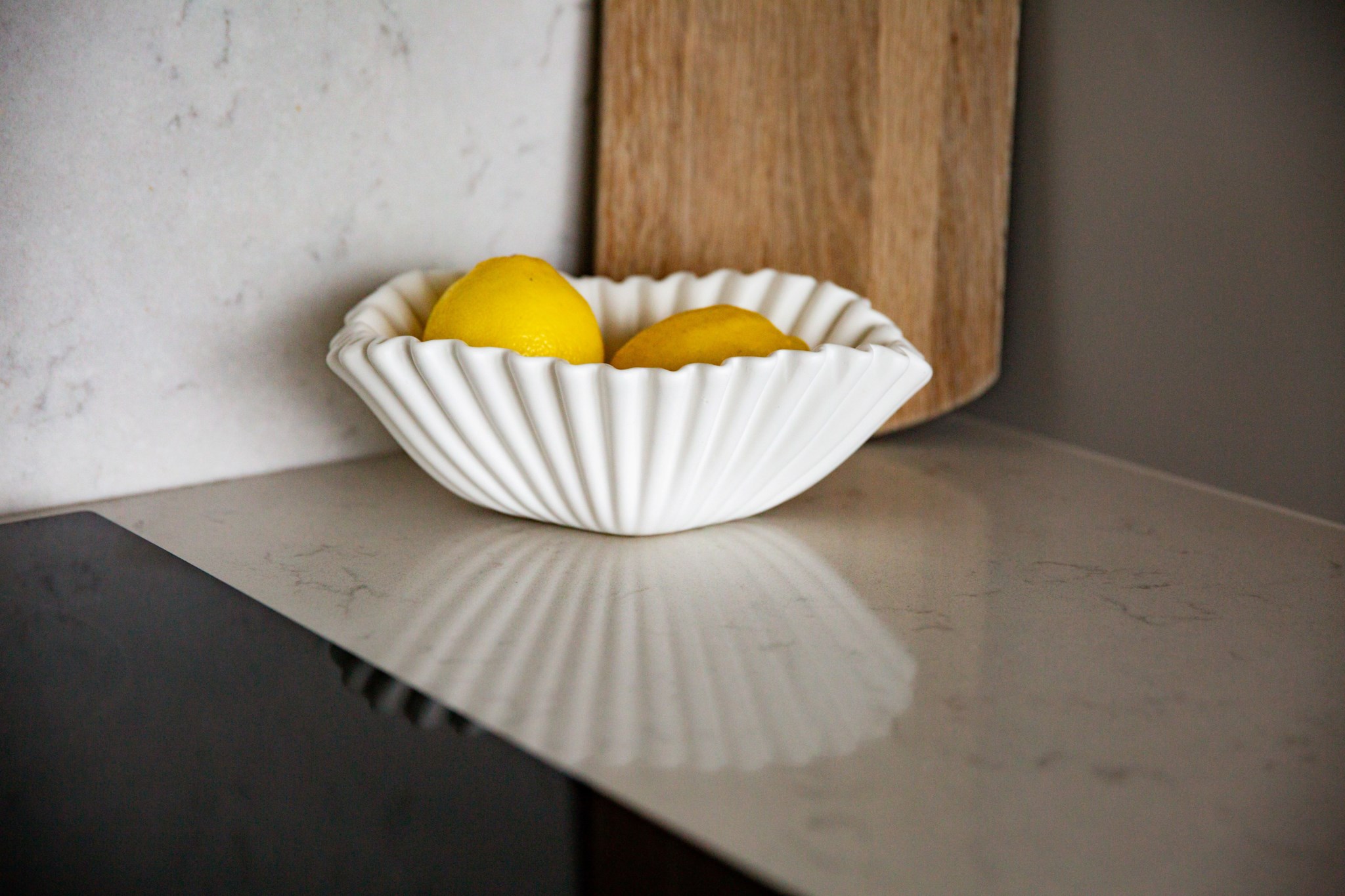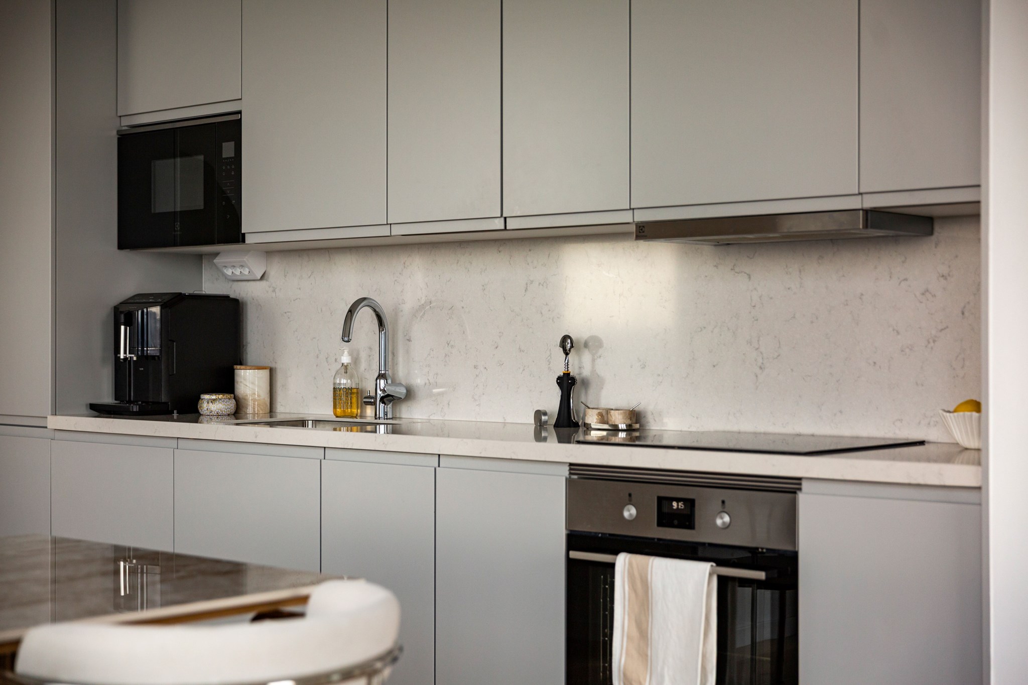 Ekparkett och ljusmålade väggar. Ljusgrått kök från HTH med vit bänkskiva i komposit-sten som följer med upp på väggen. Köket är utrustat med induktionshäll, fläktkåpa, varmluftsugn, integrerad mikro, inbyggd diskmaskin samt inbyggd kombinerad kyl/frys. Samtliga vitvaror från Electrolux. Matplats för cirka 6 personer i den öppna planlösningen.
