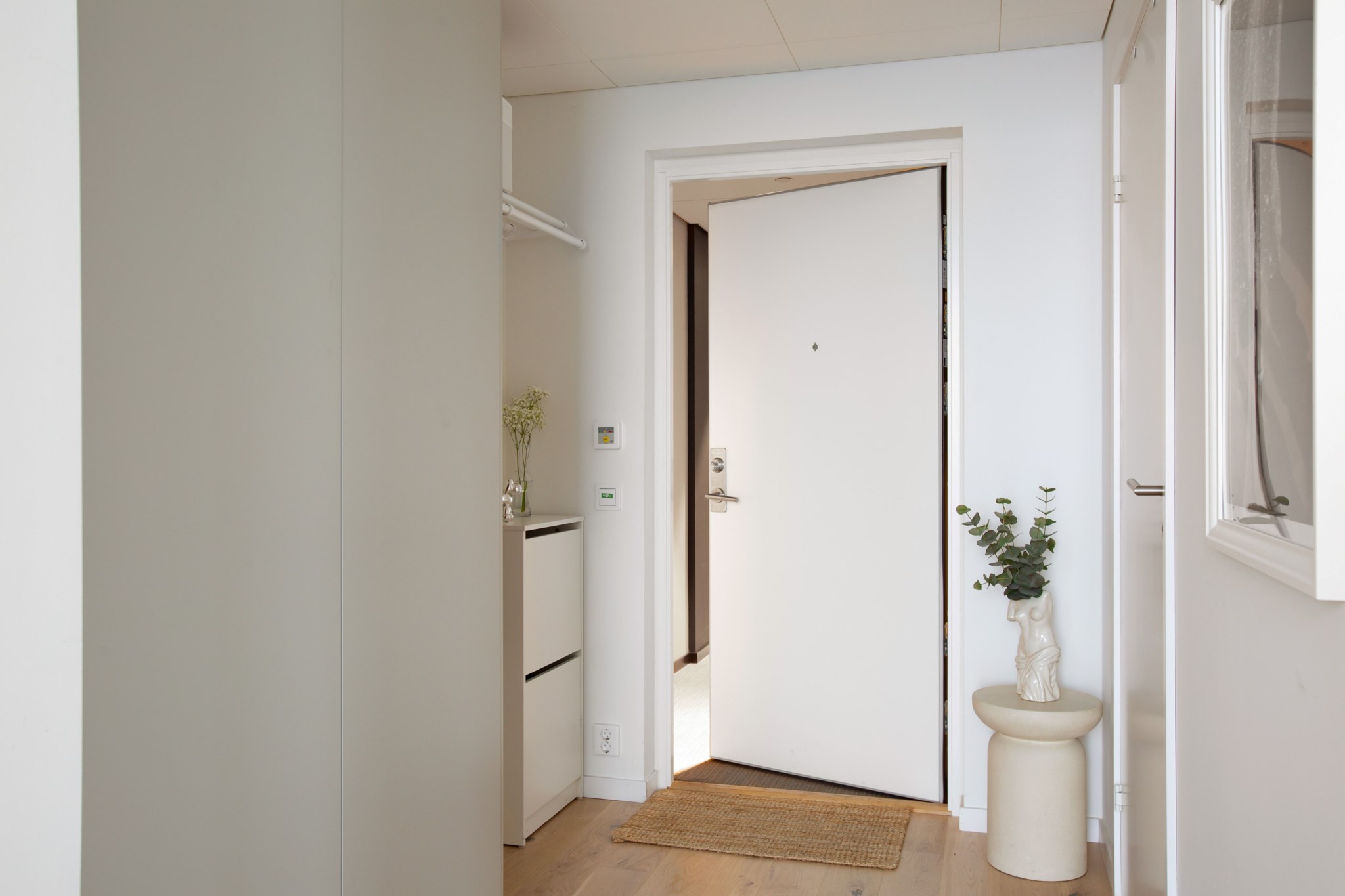 Ekparkett och ljusmålade väggar. Möblerbar hall med plats för avhängig och dekorativ inredning.