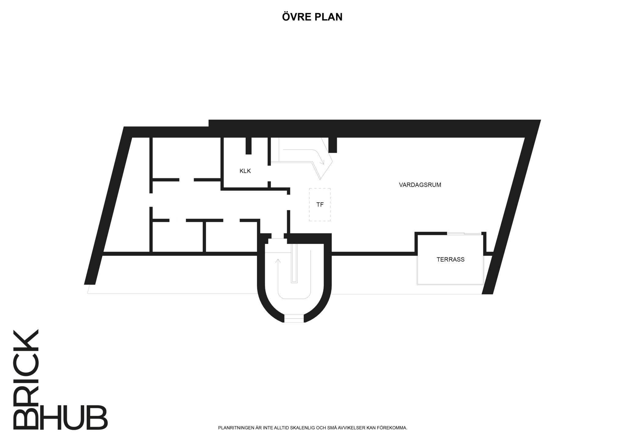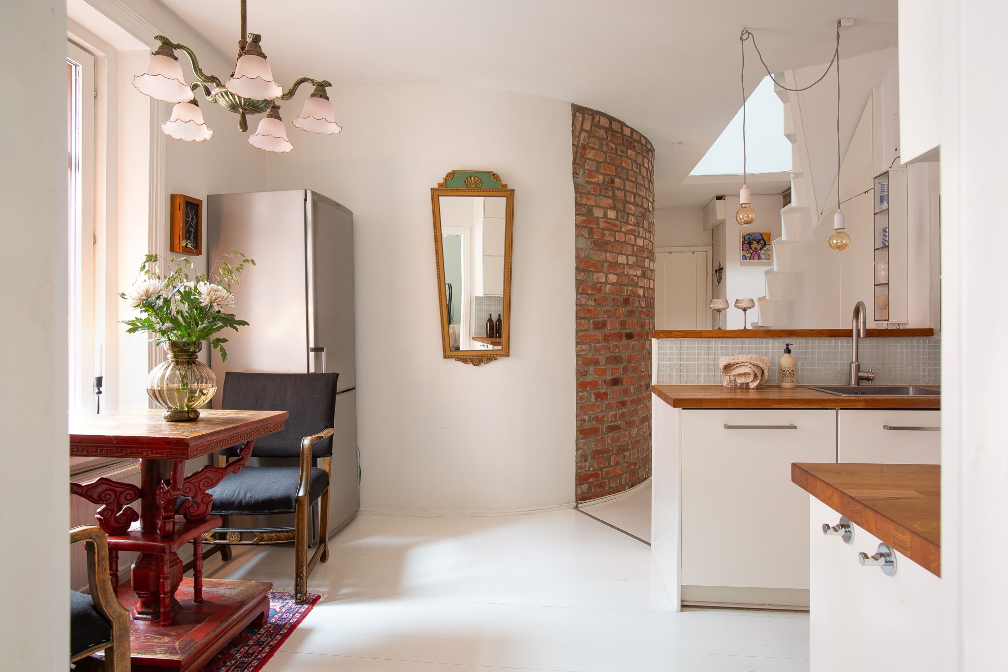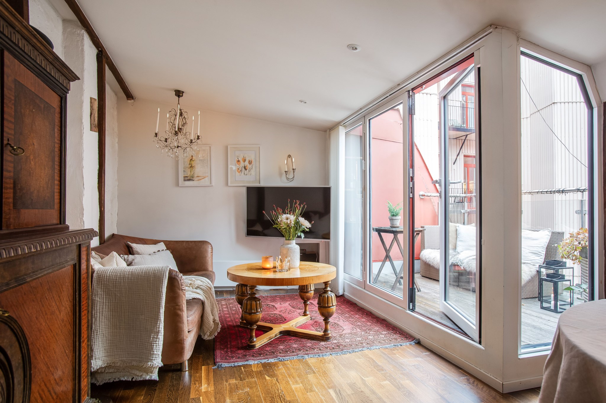 Denna lägenhet ligger på husets högsta våning och erbjuder en boendemiljö som sträcker sig över två etage. I bostaden har man tagit fram flertalet originaldetaljer, inklusive en tegelvägg och synliga takstolar. Lägenheten har tillgång till en terrassen som ligger högt upp.