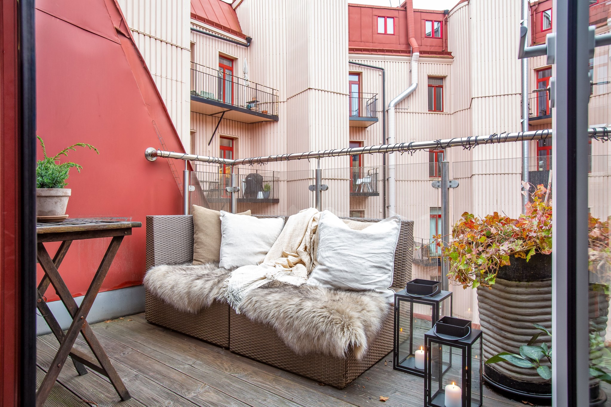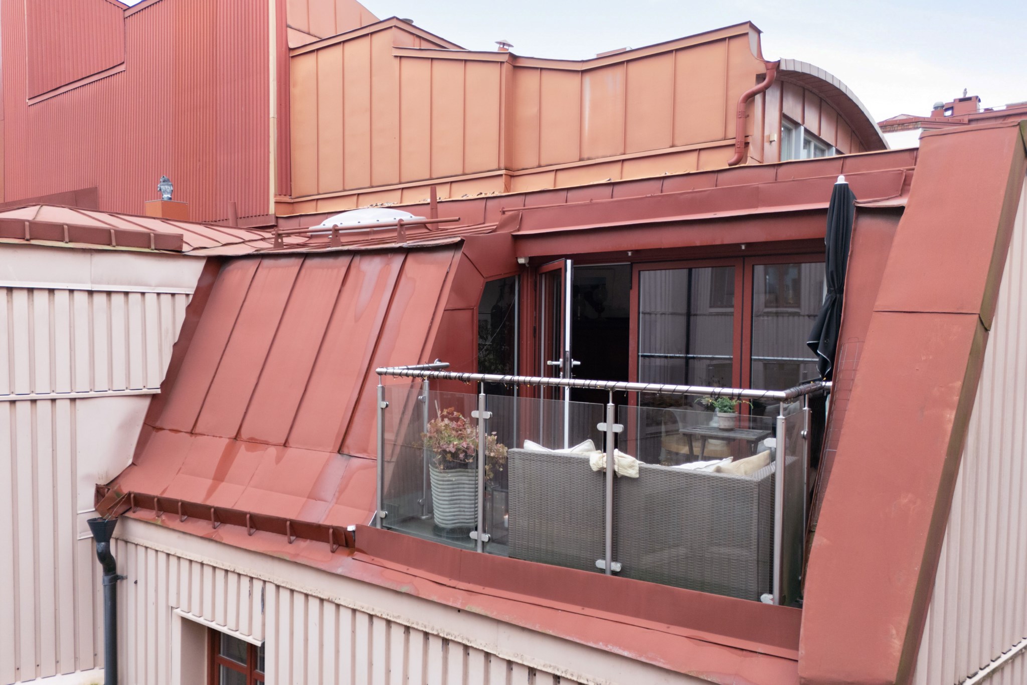 Terrass på översta plan i söderläge. Solen når terrassen ungefär mellan 12.00 och 19.00 på sommaren.