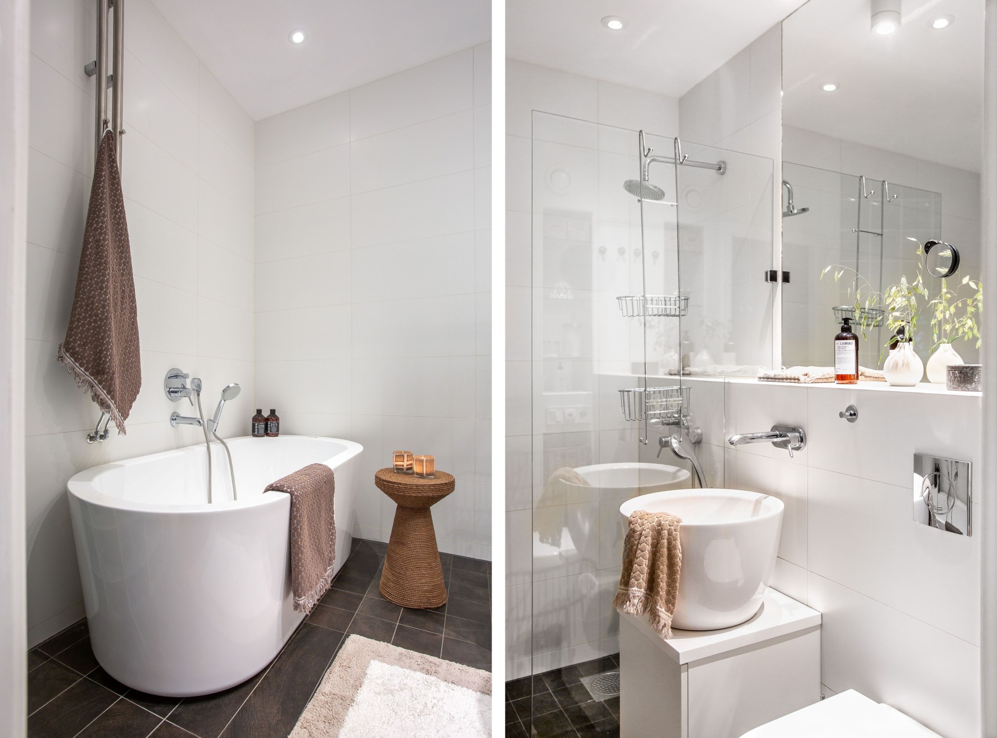 Gråbrunt klinkergolv med träkänsla och helkaklade vita väggar. Badrummet är utrustat med designat handfat med kommod, väggspegel, vägghängd WC, dusch med glasvägg, designad handdukstork samt badkar.