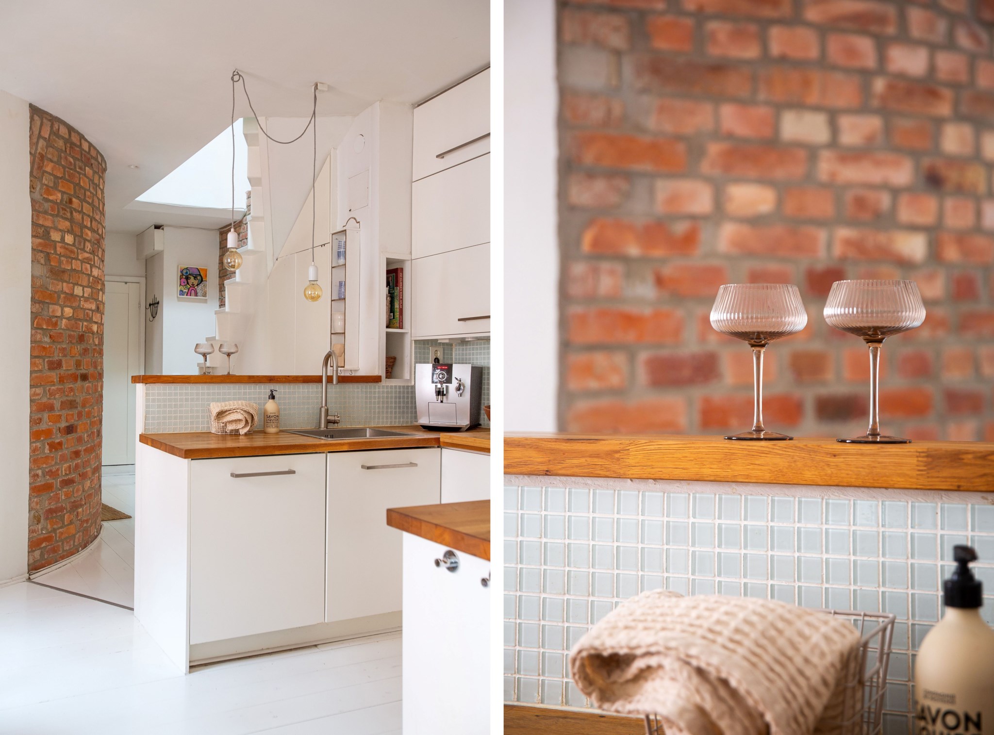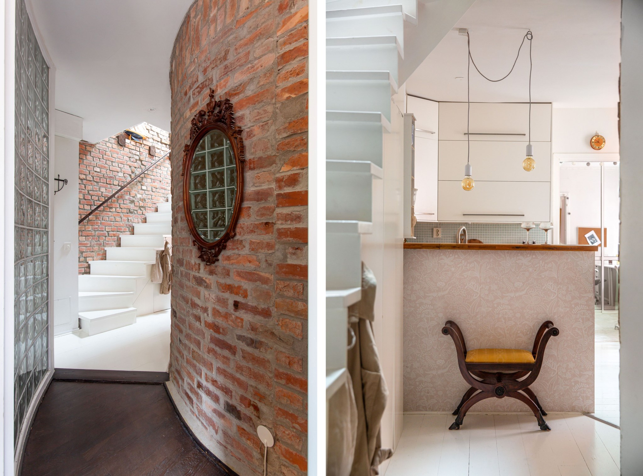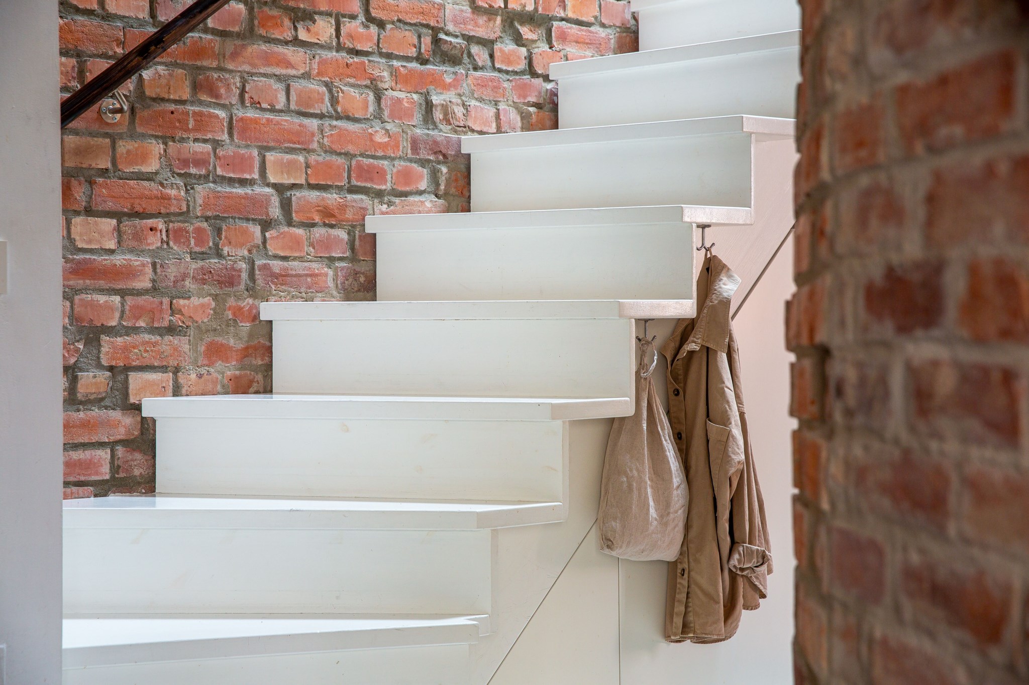 Vitmålat plankgolv och målade väggar med framtagna tegel-partier. Förvaring under trappan till övre plan.