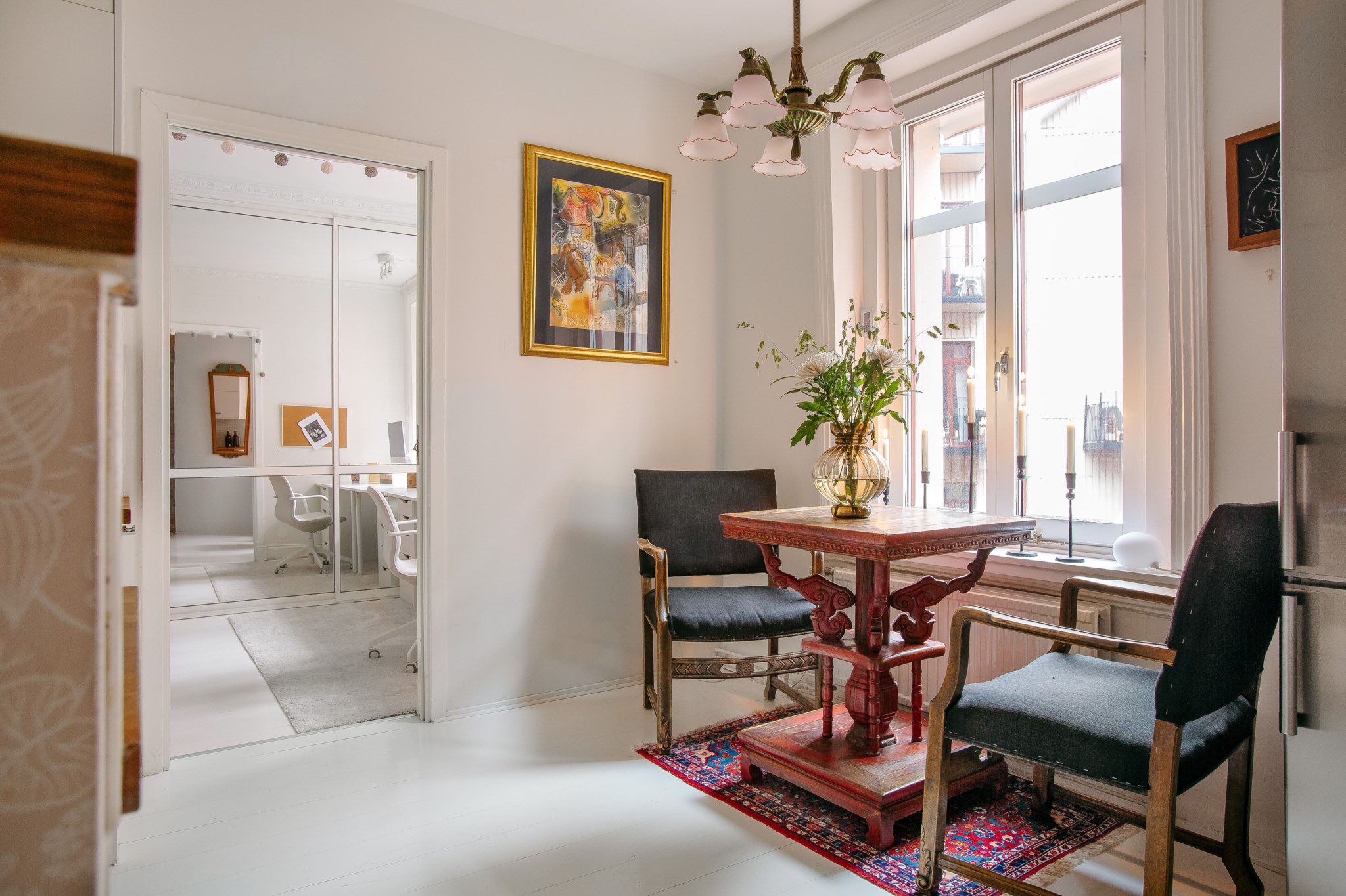 Interiören präglas av fina färg- och materialval. Badrummet är utbyggt och renoverat. Bostaden har goda lösningar för förvaring, inklusive ett vindsförråd som är lättillgängligt då det nås direkt från lägenheten.