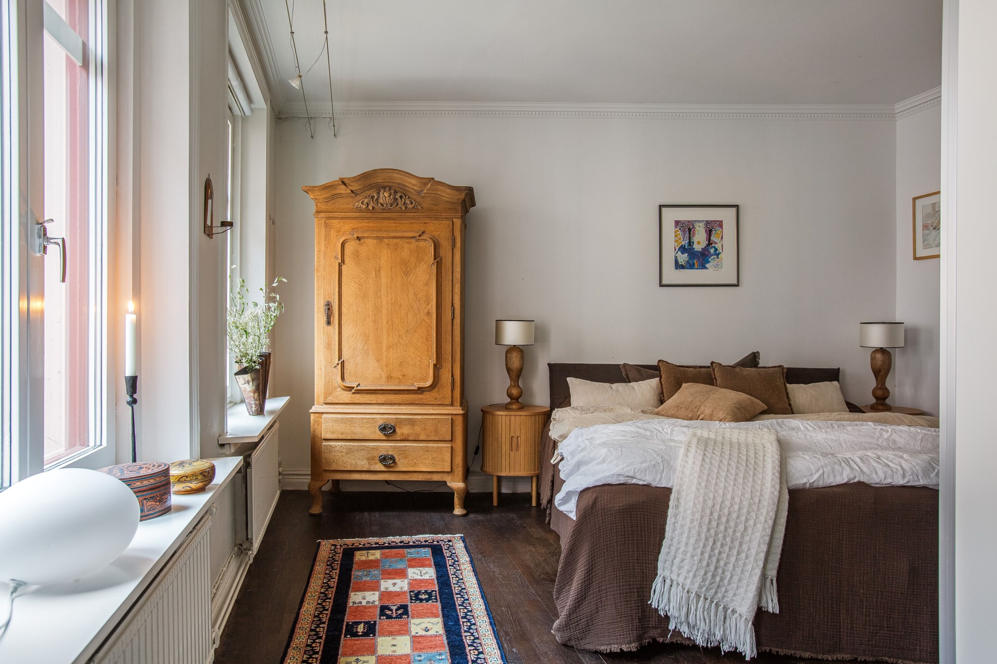 Mörk plankgolv och målade väggar. Den välvda tegelväggen följer med in i sovrummet. Plats för dubbelsäng med tillhörande sängbord. Förvaring i garderober och plats för arbetsbord.
