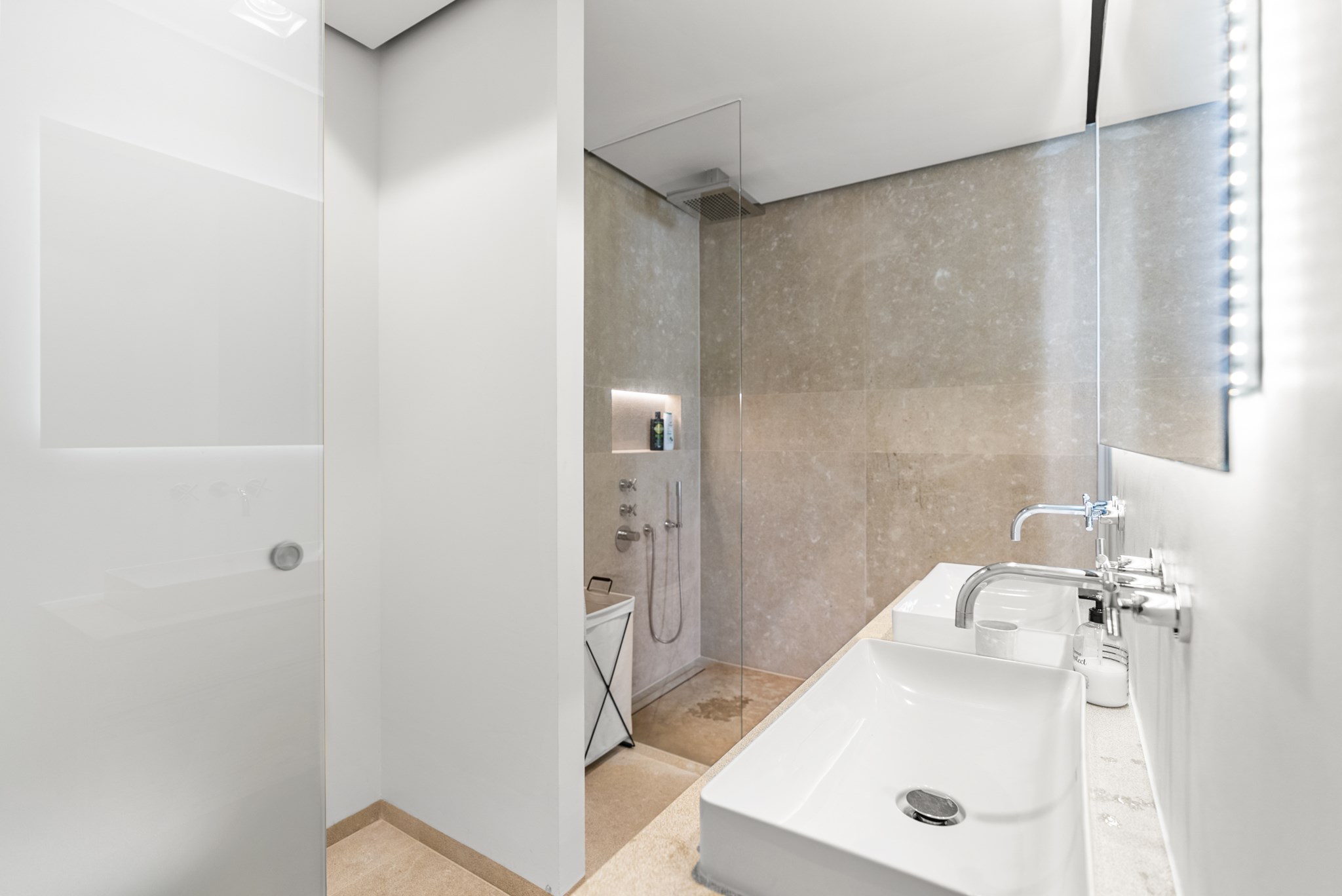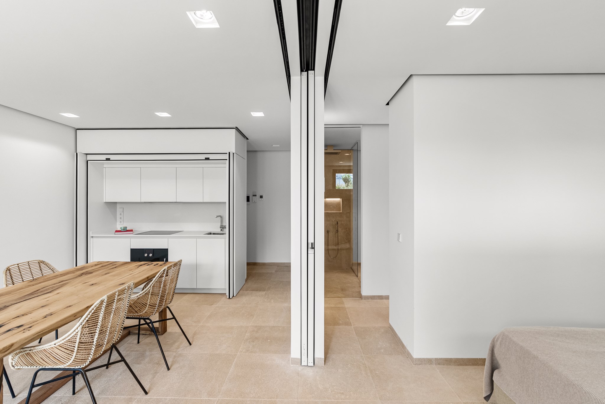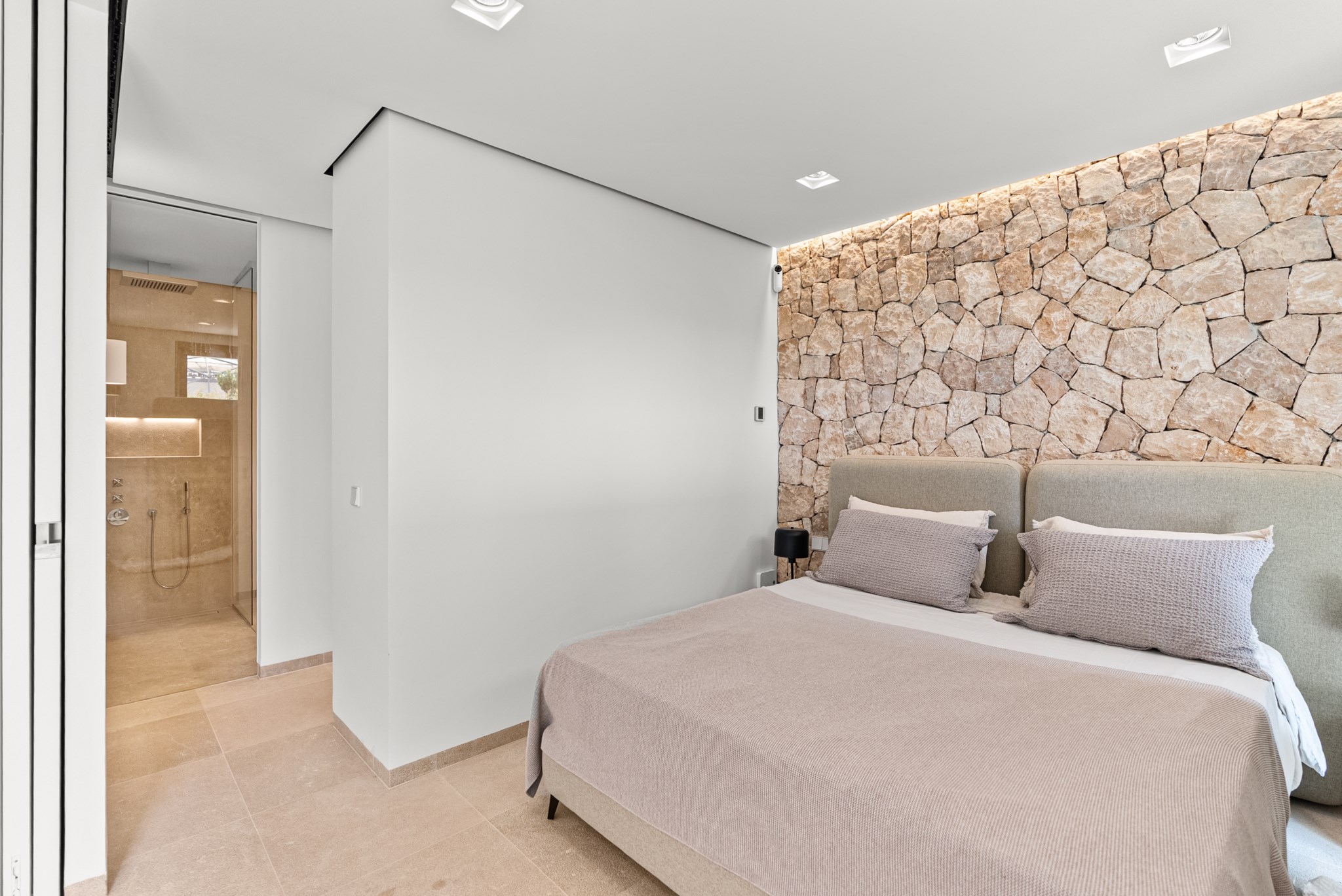 Det elegant designade sovrummet har ett eget badrum. Det ljusa vardagsrummet och matsalen, tillsammans med det moderna, fullt utrustade köket, skapar en välkomnande atmosfär. Högkvalitativa material som naturstensgolv och stenväggar betonar fastighetens lyxiga karaktär.
