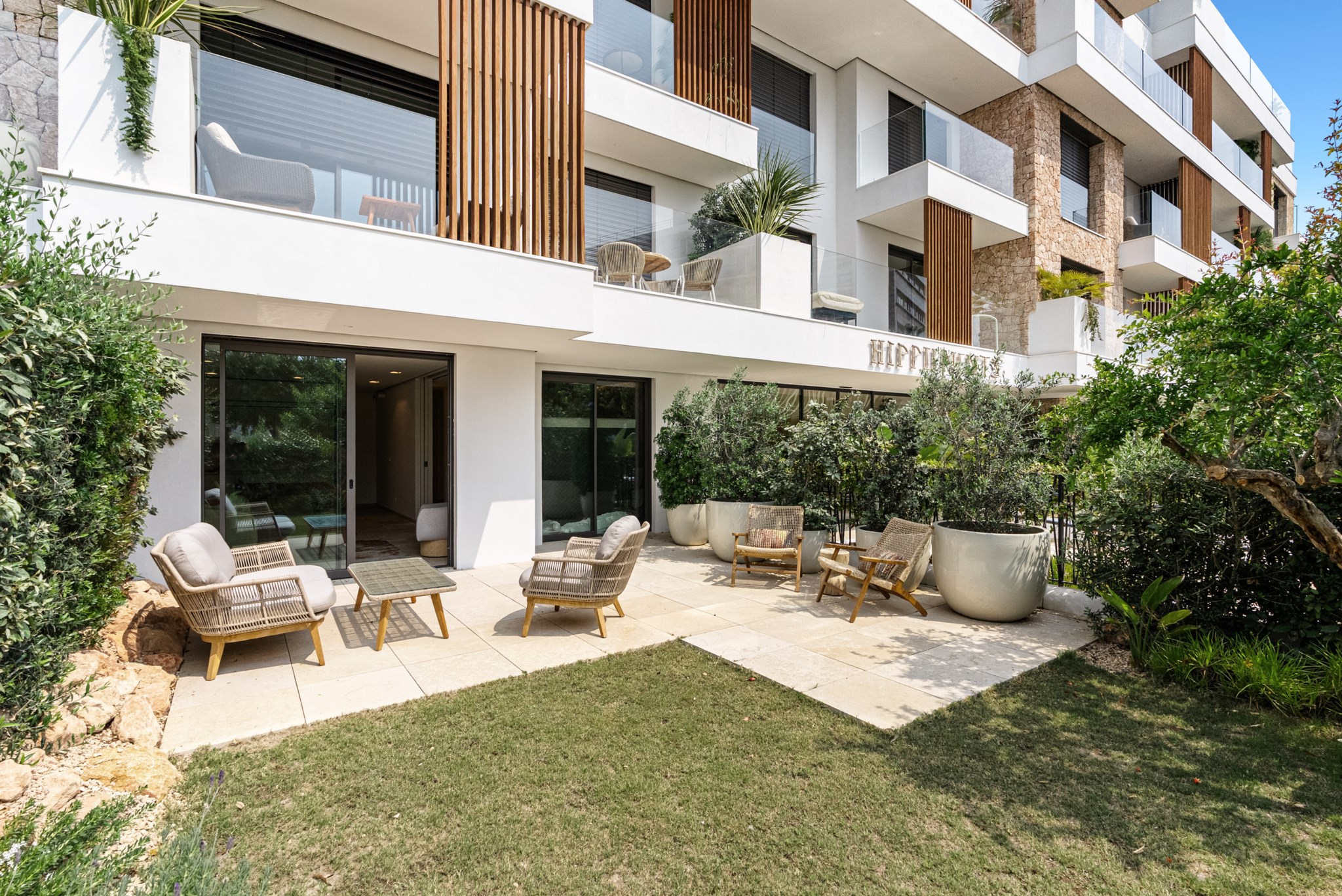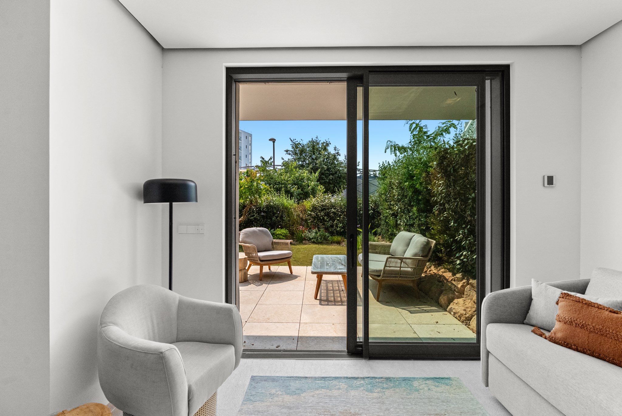 Med en generös boyta på 85 m² och en privat trädgård med terrass erbjuder lägenheten en bekväm och elegant boendeupplevelse som kombinerar modern livsstil med medelhavsinspirerad avkoppling.