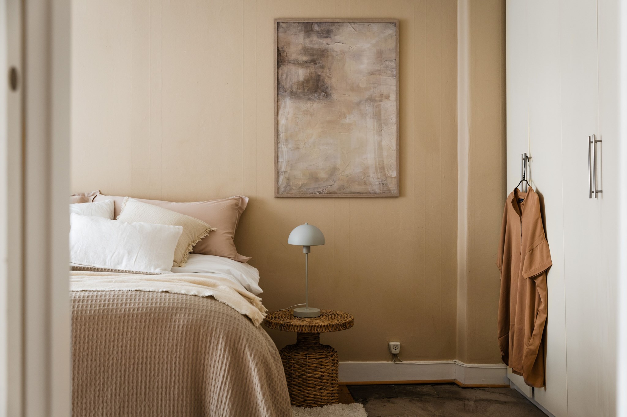 Plankgolv och ljusbeiga målade väggar. Plats för säng och tillhörande sängbord. I taket finns en takrosett. Förvaring i 2 garderober.
