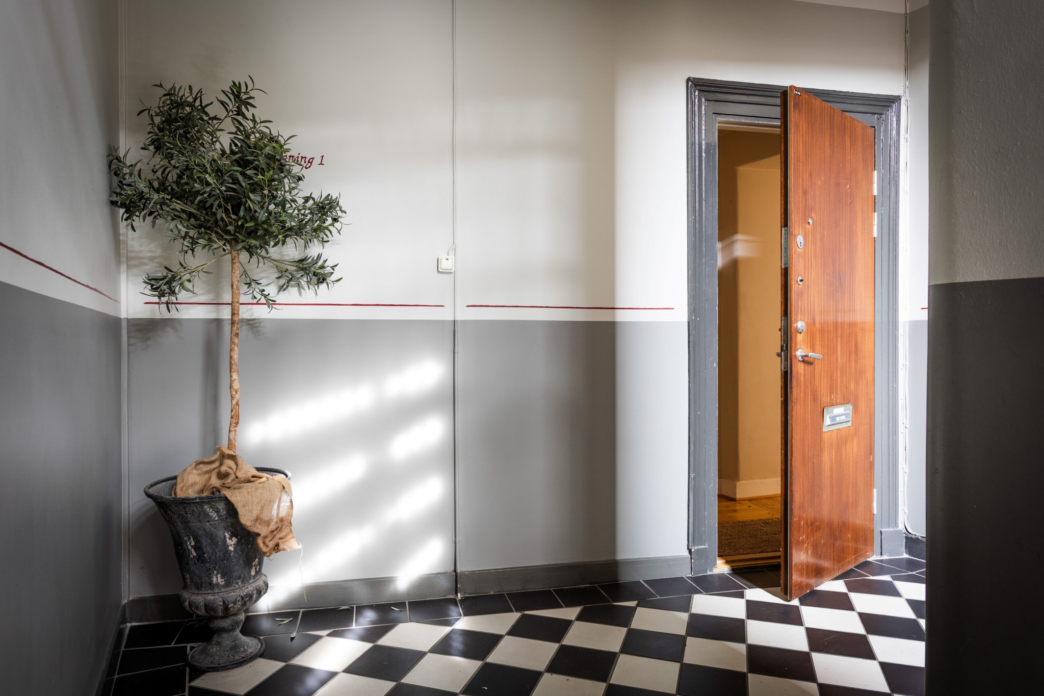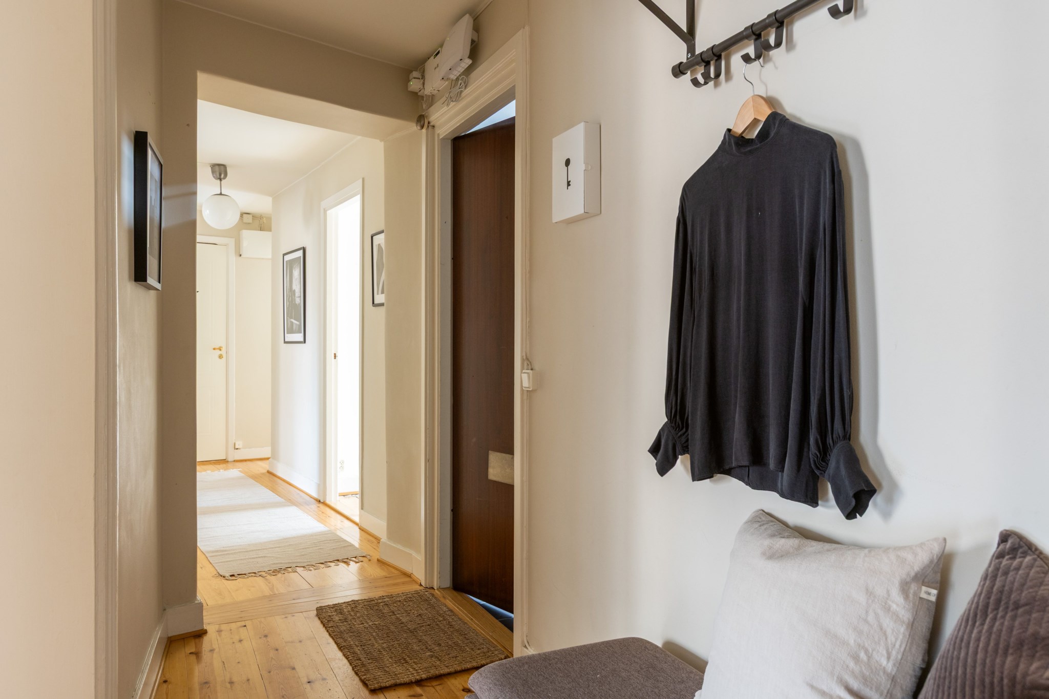 Plankgolv och ljusbeiga målade väggar. Plats för avhängning.