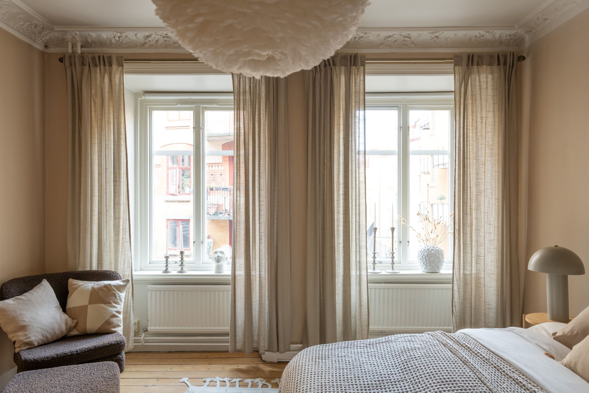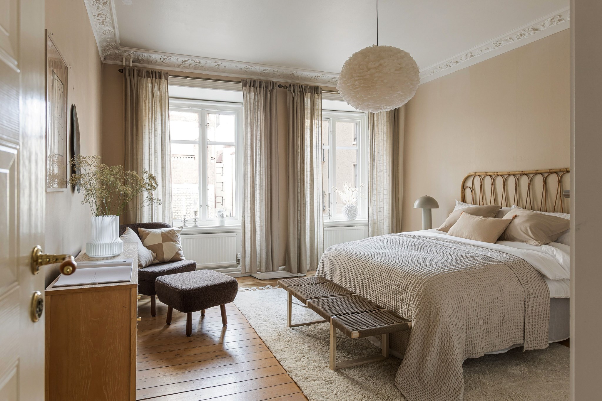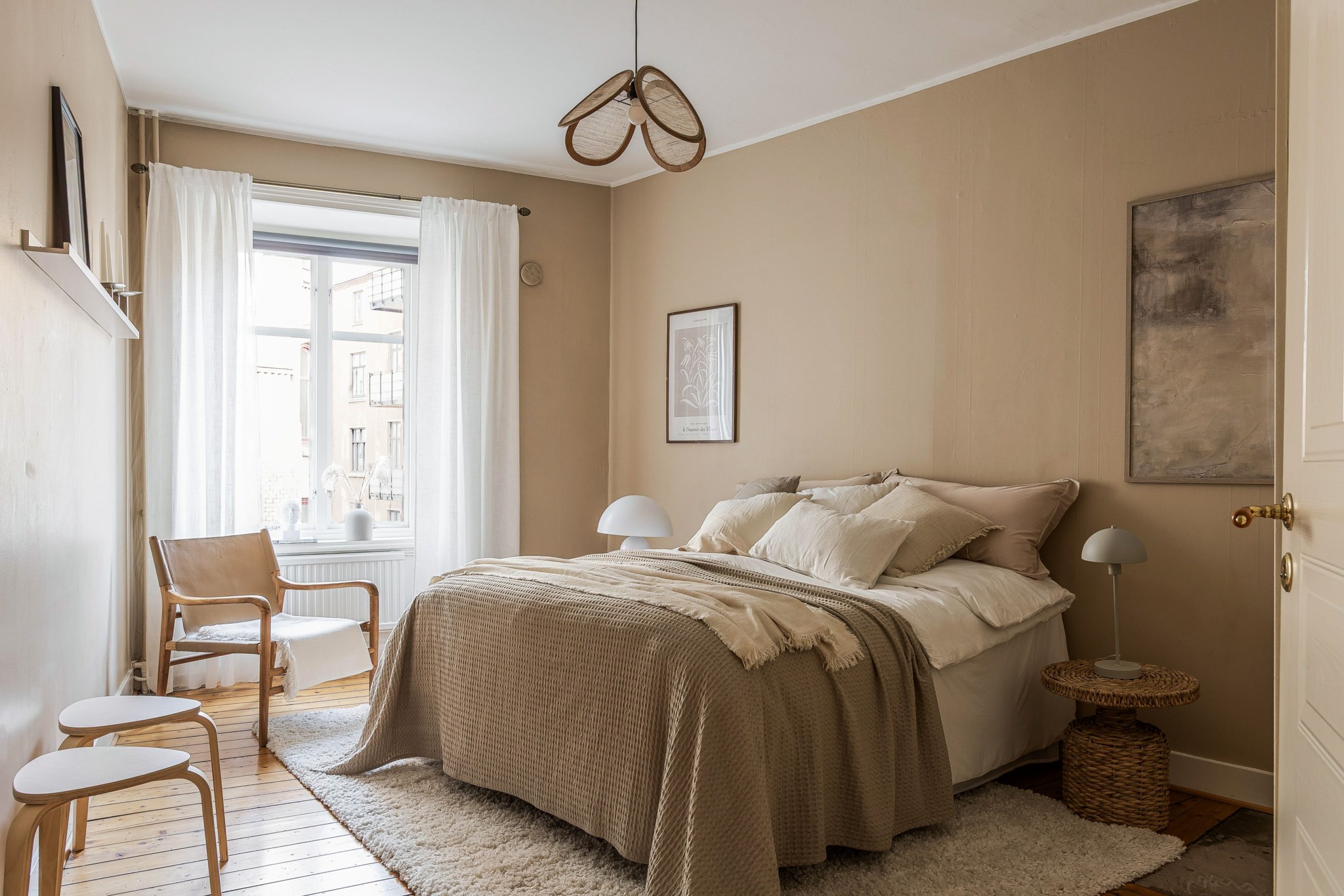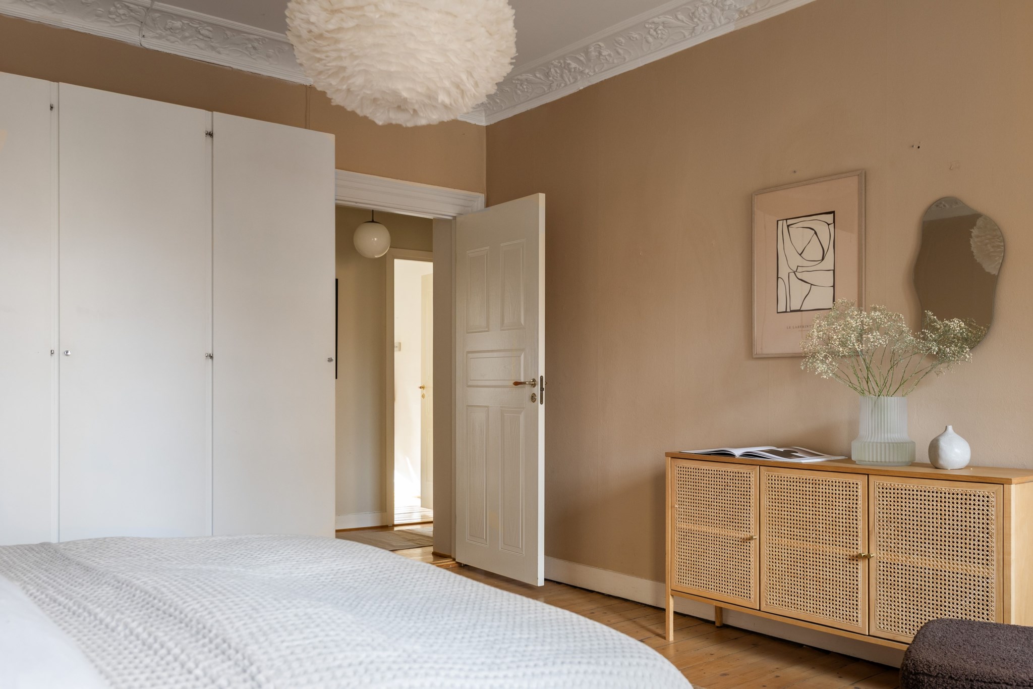 Plankgolv och ljusbeiga målade väggar. Plats för dubbelsäng och tillhörande sängbord. I taket finns en takrosett. Förvaring i 4 garderober.