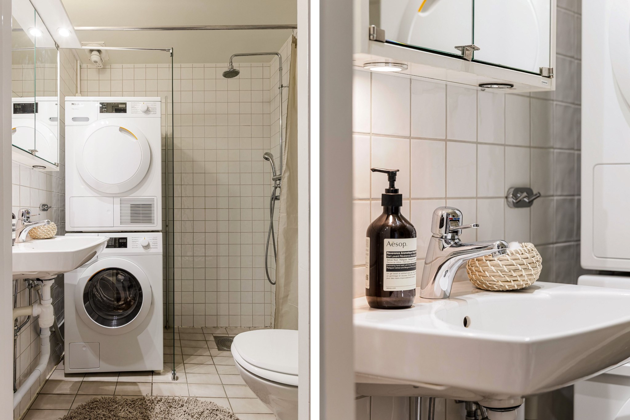 Helkaklat badrum utrustat med WC, handfat, spegel samt dusch. Här finns även tvättmaskin och torktumlare.