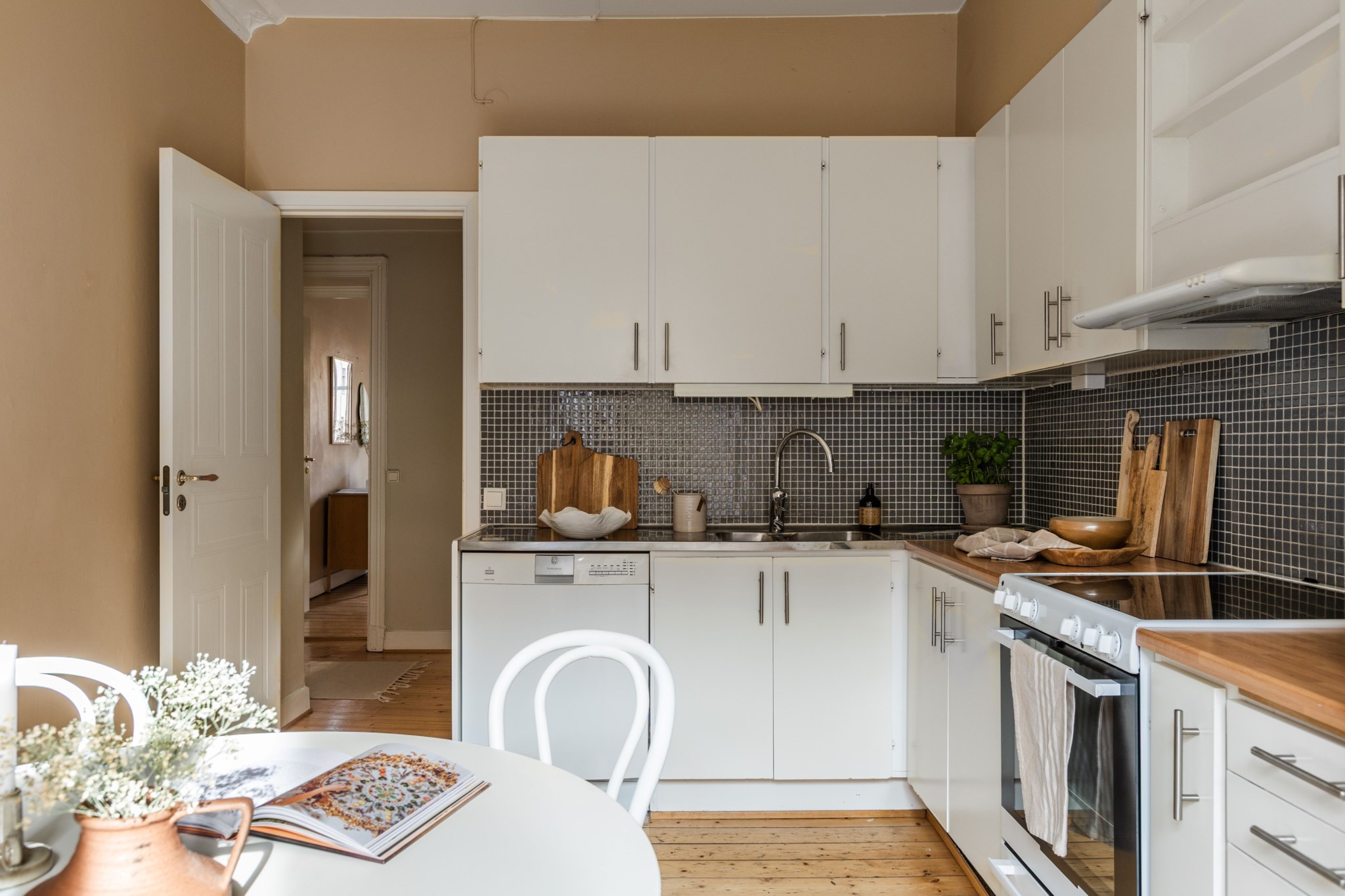 Plankgolv och ljusbeiga målade väggar. Köket är utrustat med spis med ugn, fläktkåpa, diskmaskin samt kombinerad kyl/frys. Plats för matbord för fyra personer.