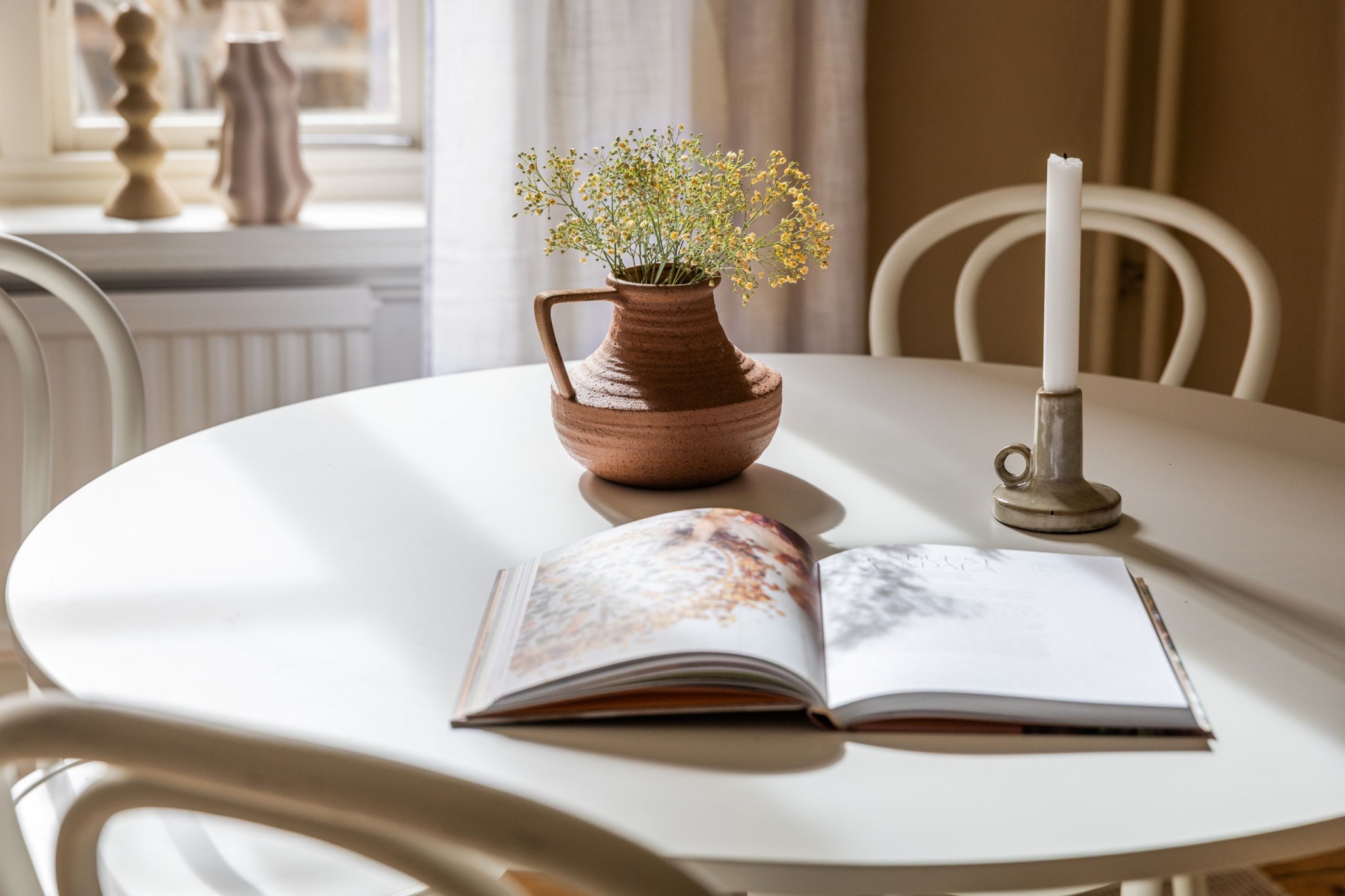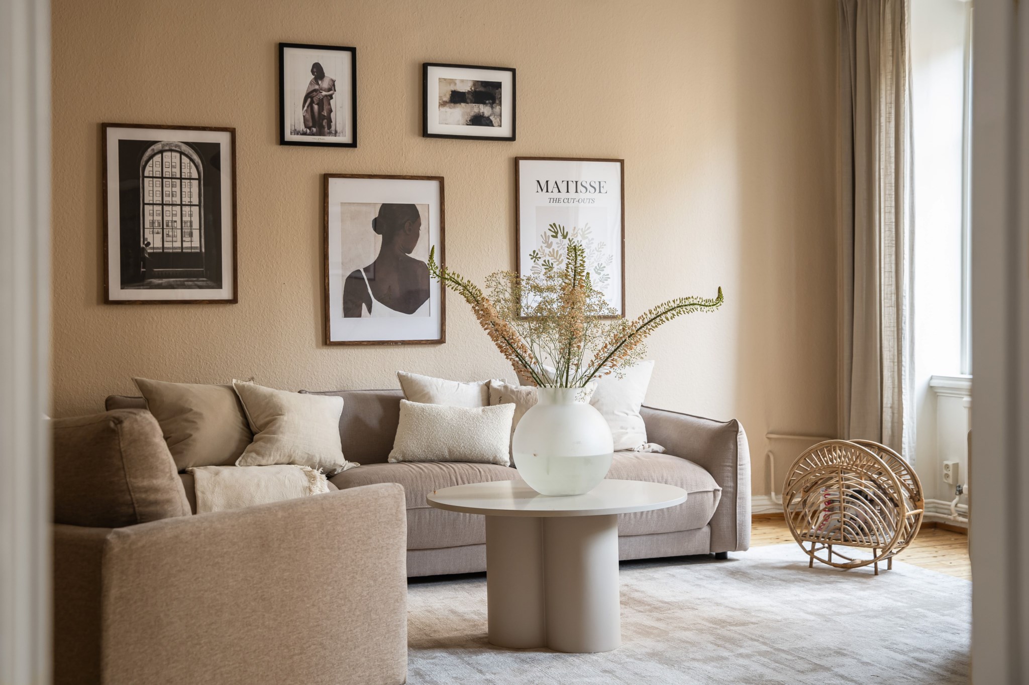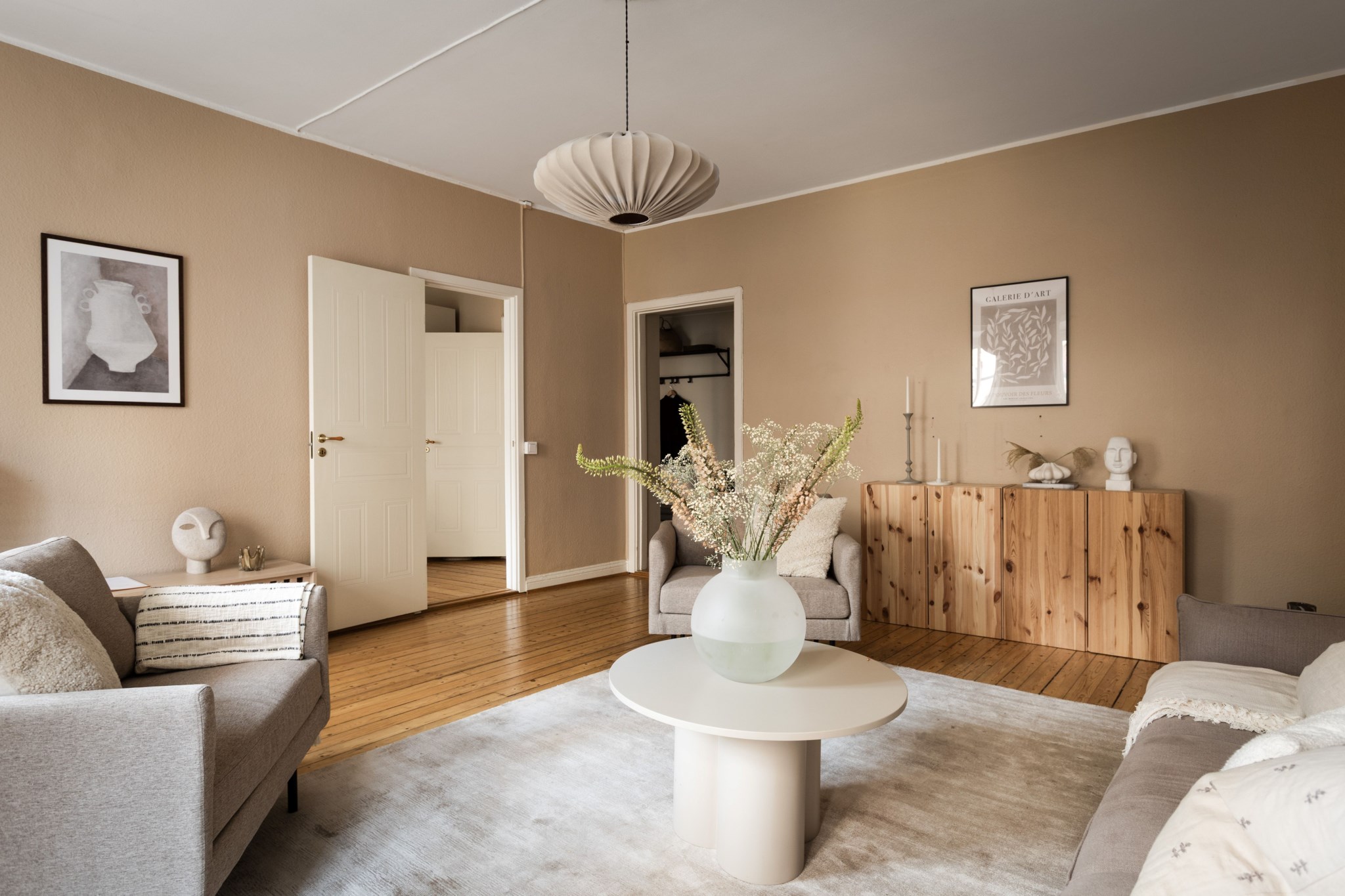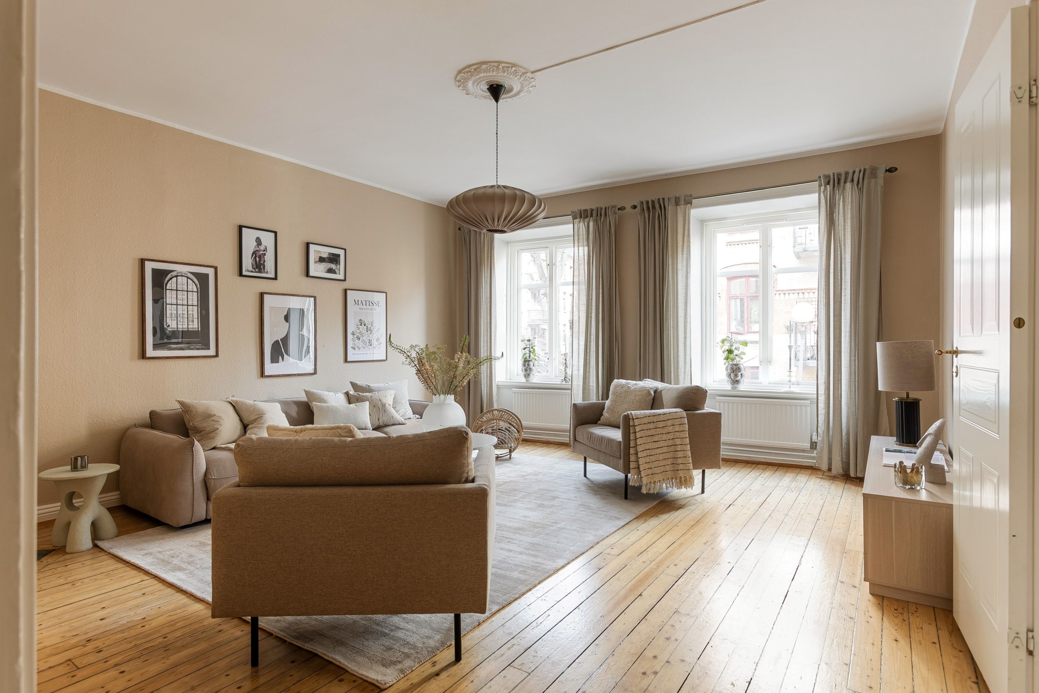 Plankgolv och ljusbeiga målade väggar. Rummet har stuckaturer och takrosett. Plats för soffgrupp och TV-möbel samt matsalsbord.
