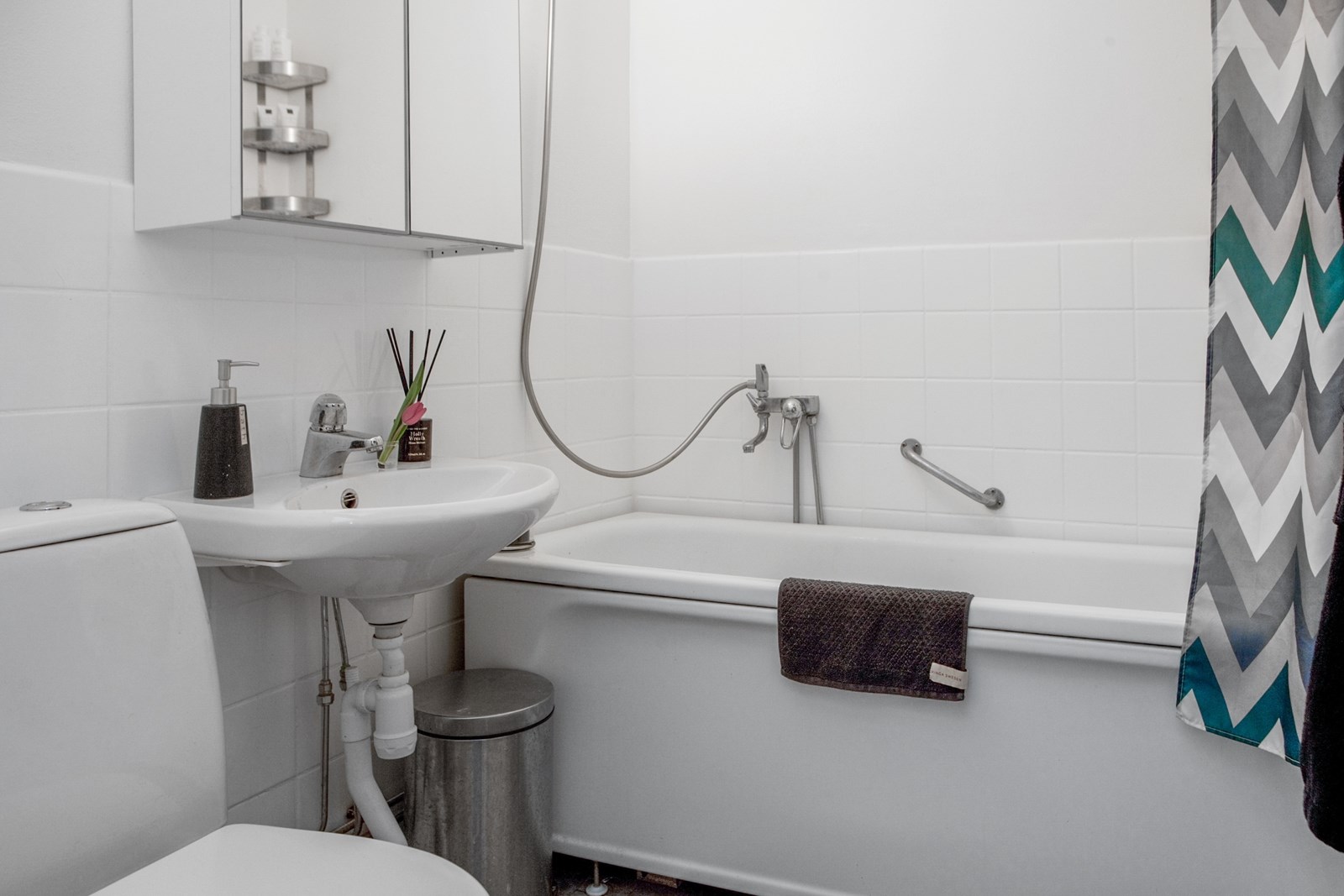 Klinkergolv och helkaklade väggar. Badrummet är utrustat med badkar, handfat med kommod, spegelskåp samt wc. Förvaring finns i väggskåp.