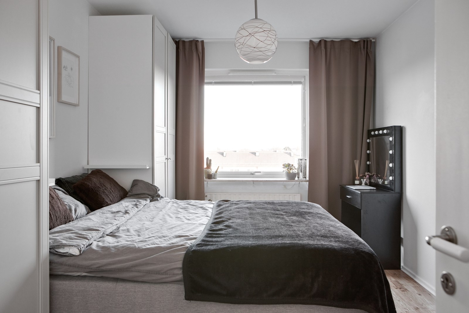 Parkettgolv och ljusmålade väggar. Sovrummet rymmer dubbelsäng och kompletterande möblemang samt har förvaring i garderober. Fönster ger ett behagligt ljusinsläpp och bidrar till en lugn sovmiljö.