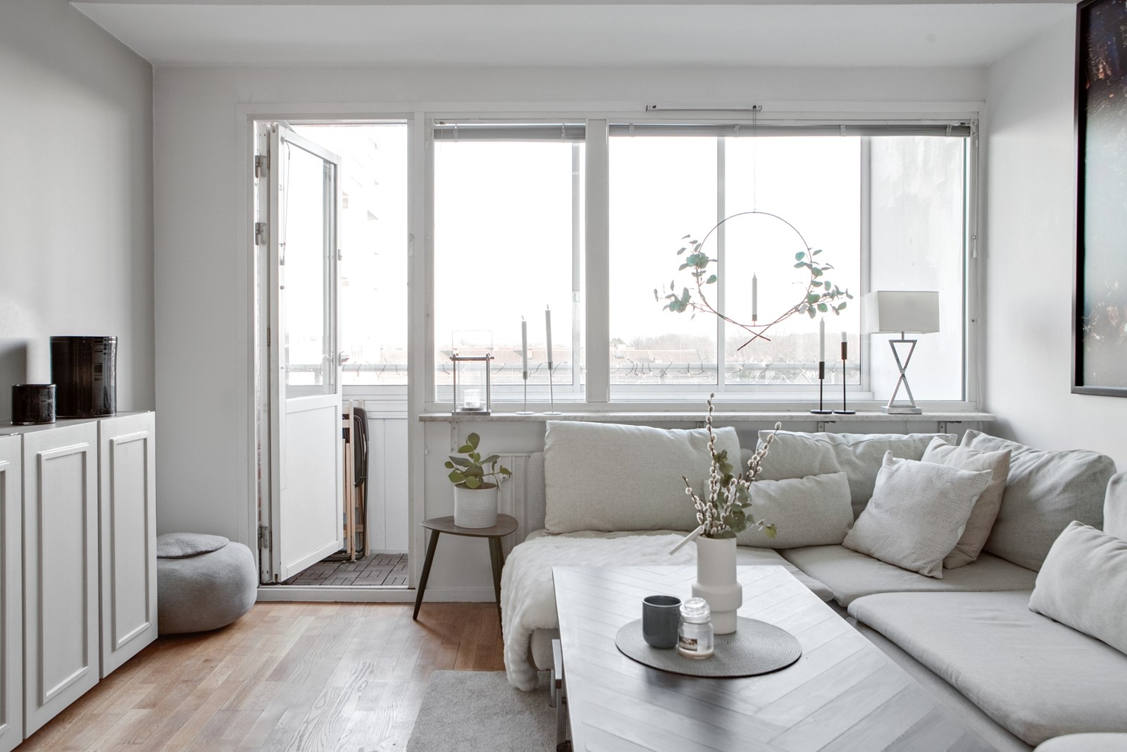 Parkettgolv och ljusa väggar. Rummet erbjuder plats för soffgrupp och matplats med generöst ljusinsläpp från fönsterparti. Härifrån nås den inglasade balkongen som skapar en naturlig förlängning av rummet och ger en trivsam vistelseyta.